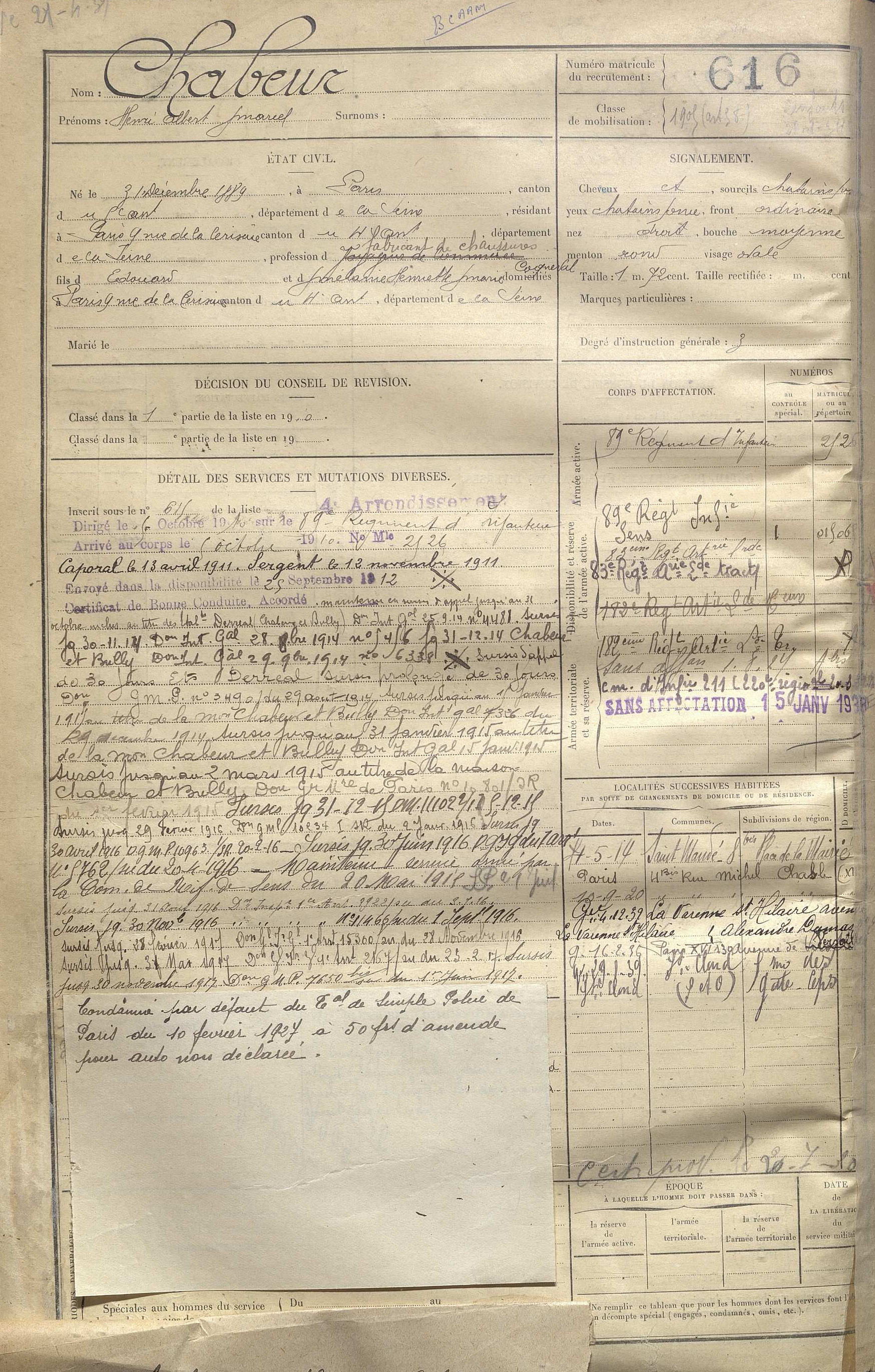 Henri-Albert-Marcel Chabeur, né le 31 décembre 1889 à Paris 5e arrondissement, était le fils d'Édouard Chabeur, représentant de commerce, et de Mélanie-Henriette-Marie Coqueval.