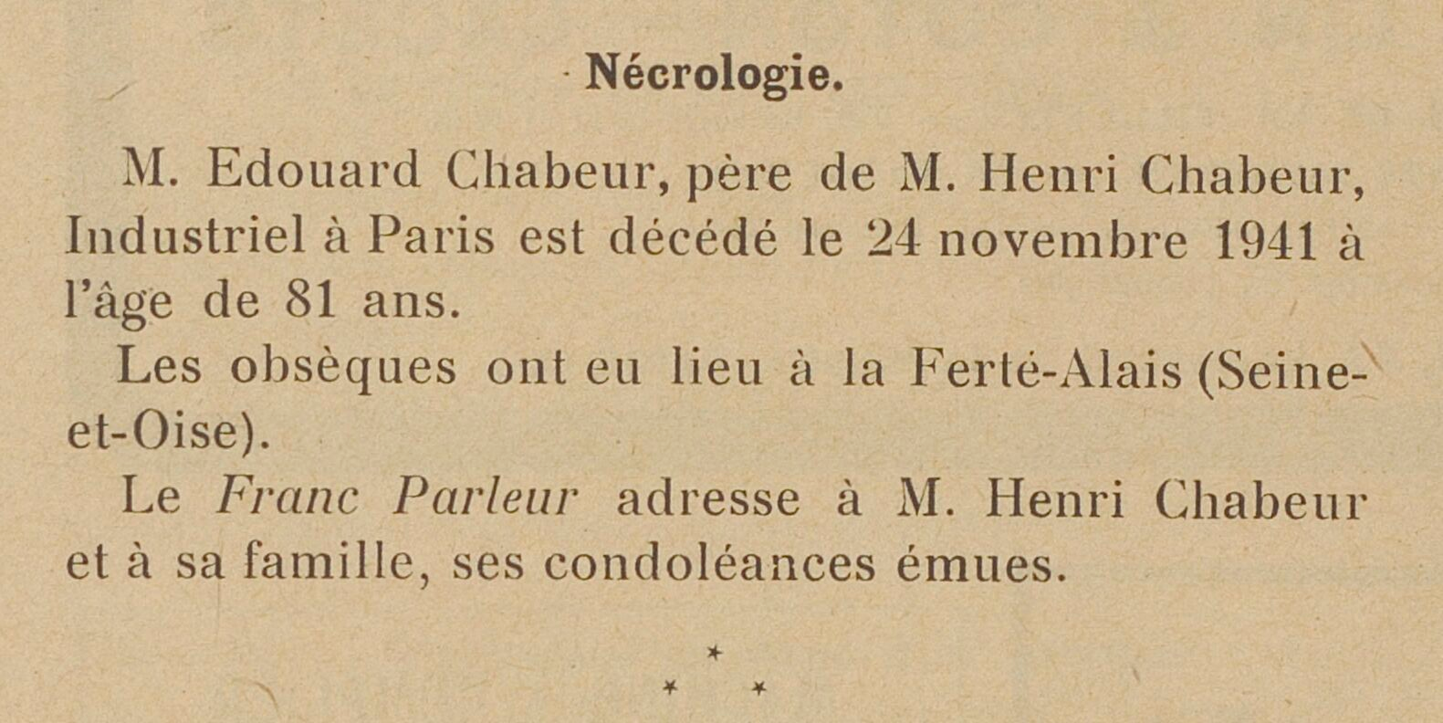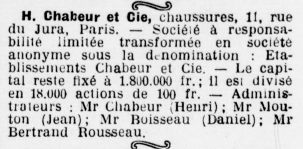 “Paris. — Modification. — Soc. CHABEUR et Cie, 11, Jura. — Décès de M. Bully. — Ses héritiers cèdent 50 parts à M. Henri Chabeur. — 7 juin 1928. — An. P.”