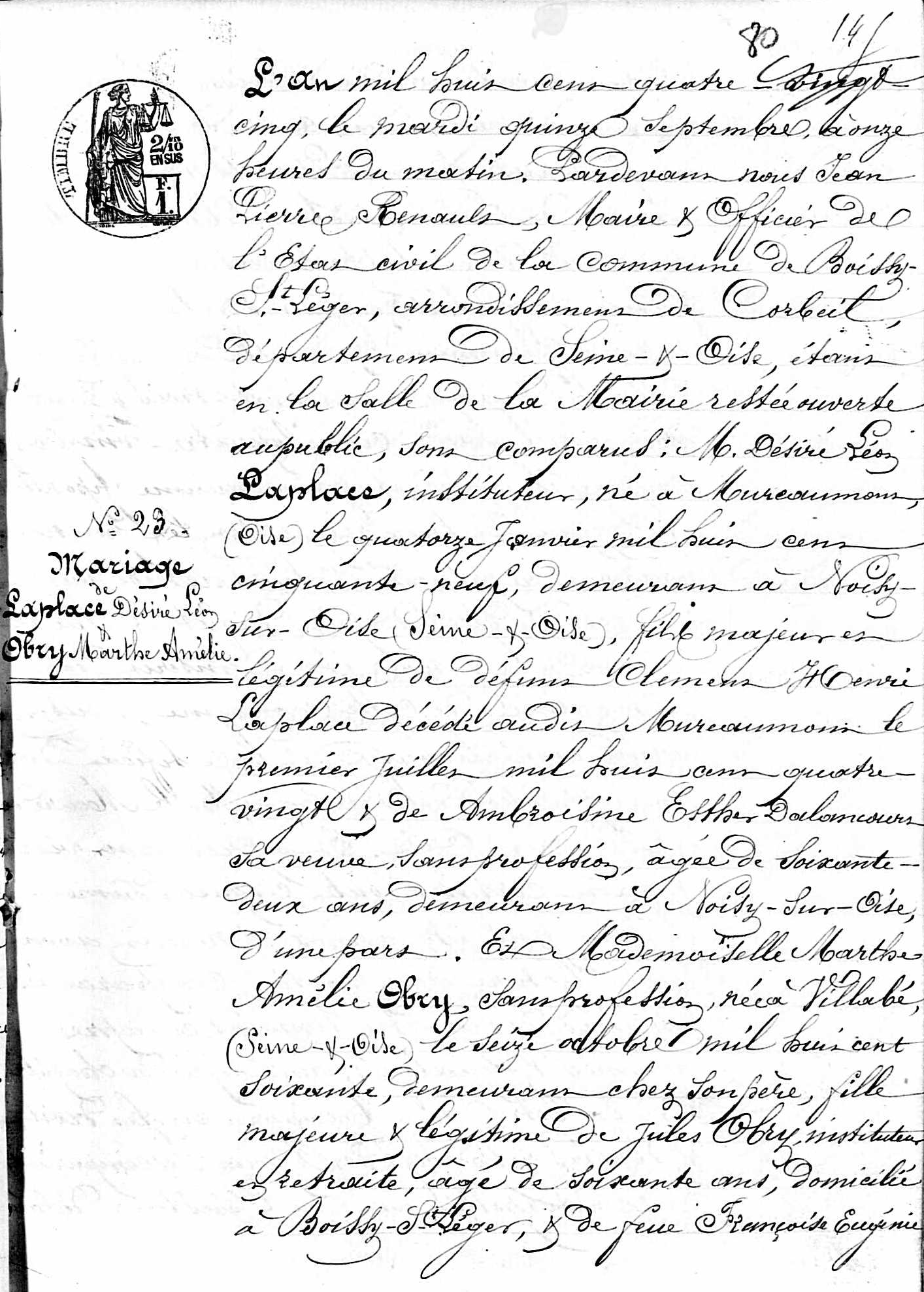L'an mil huit cent quatre-vingt-cinq, le mardi quinze septembre, onze heures du matin, devant nous Jean Pierre Renault, Maire et Officier de l'État civil de la commune de Boissy-Saint-Léger, arrondissement de