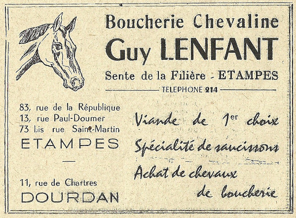 Texte: “Boucheries chevalines Guy Lenfant (Ancienne maison Dozias) — Étampes — 83, rue de la République — 13, rue Paul-Doumer — 73, rue Saint-Martin — Étampes — Dourdan: 11, rue de Chartres — Viande de première qualité — Spécialité de viande hachée — Saucissons cuits et secs — Andouille de Vire — Achats de chevaux de boucherie — Imprimerie Bodin - Étampes (S.-et-O.).”