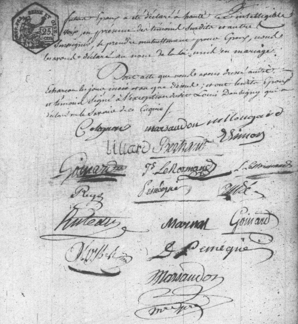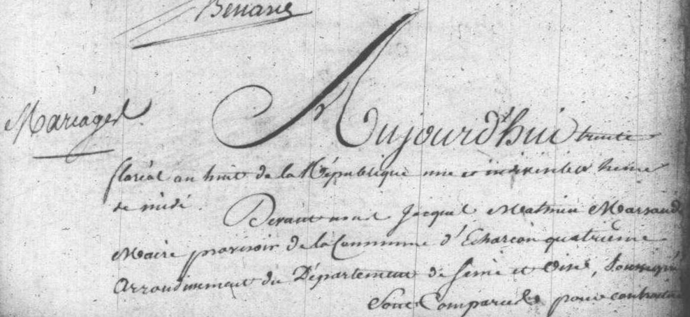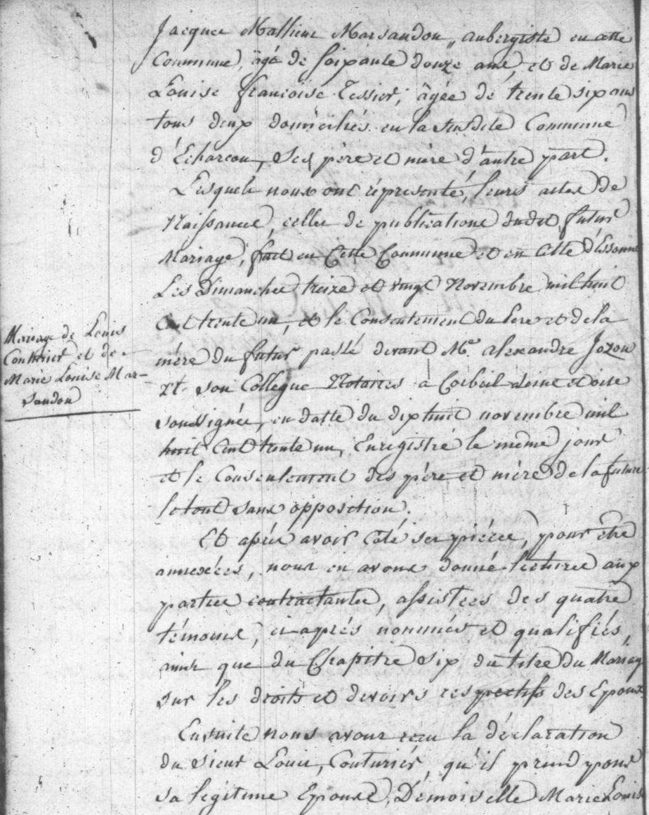 Union dont naquit Marie-Louise-Joséphine Marsaudon (1816-?), mariée à Écharcon le 23 novembre 1831 avec Louis Couturier.