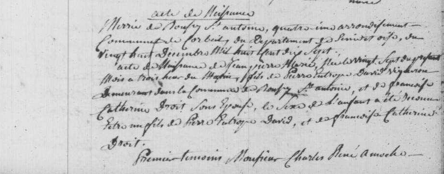 Jean-Pierre-Marie David, né le 27 octobre 1817 à Boussy-Saint-Antoine, était le fils du vigneron Pierre-Eutrope David (†1830) et de François-Catherine Droit.