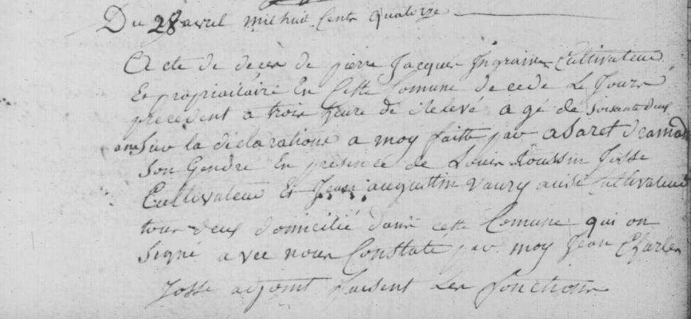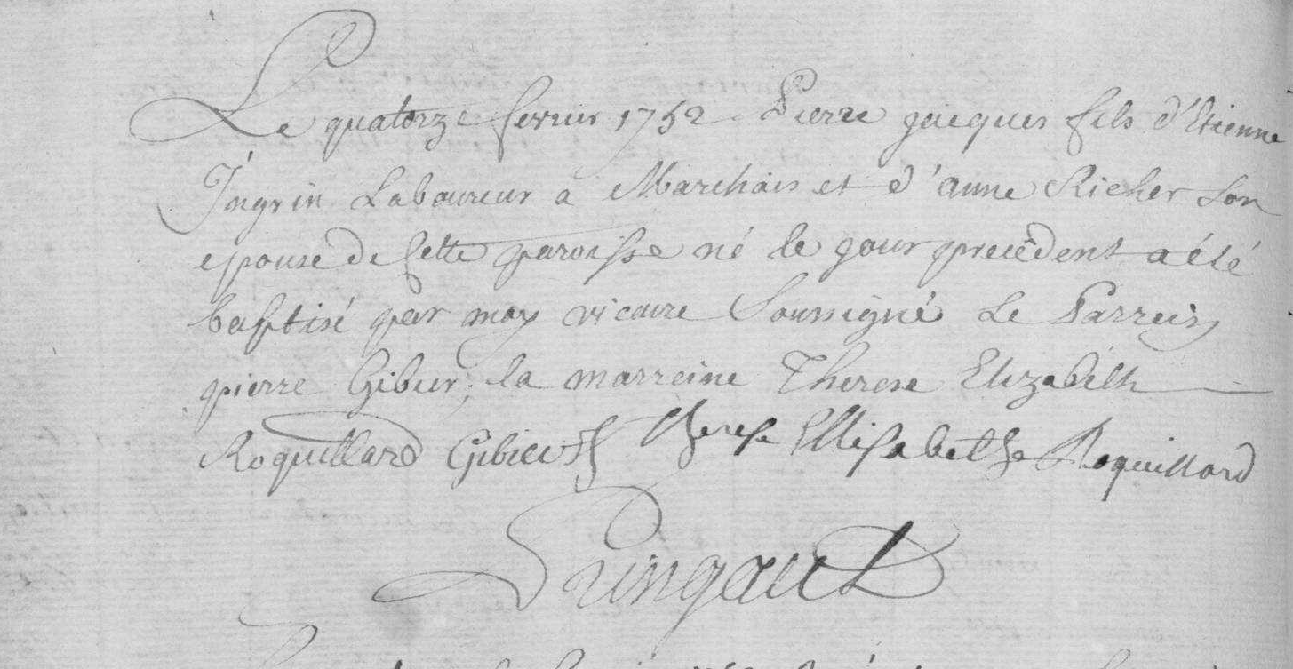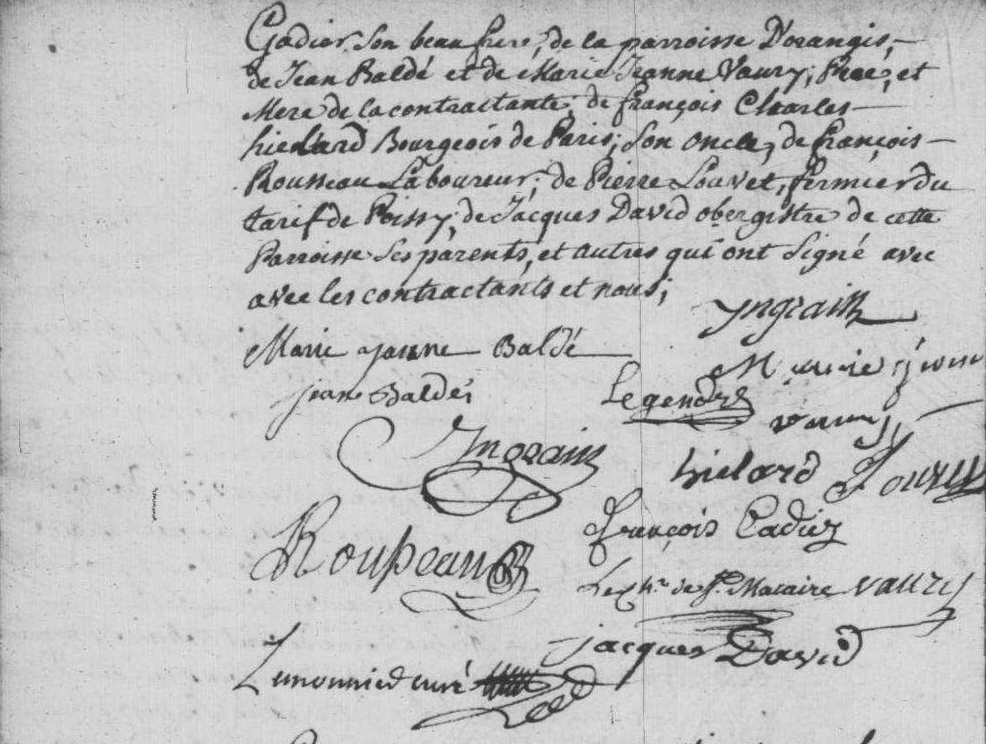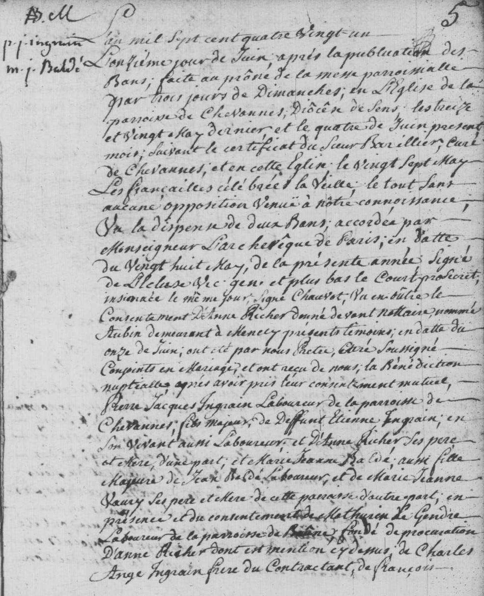 4° Madeleine Ingrain (1745-1829), mariée à Soisy-sur-École le 18 février 1772 avec Mathurin Legendre