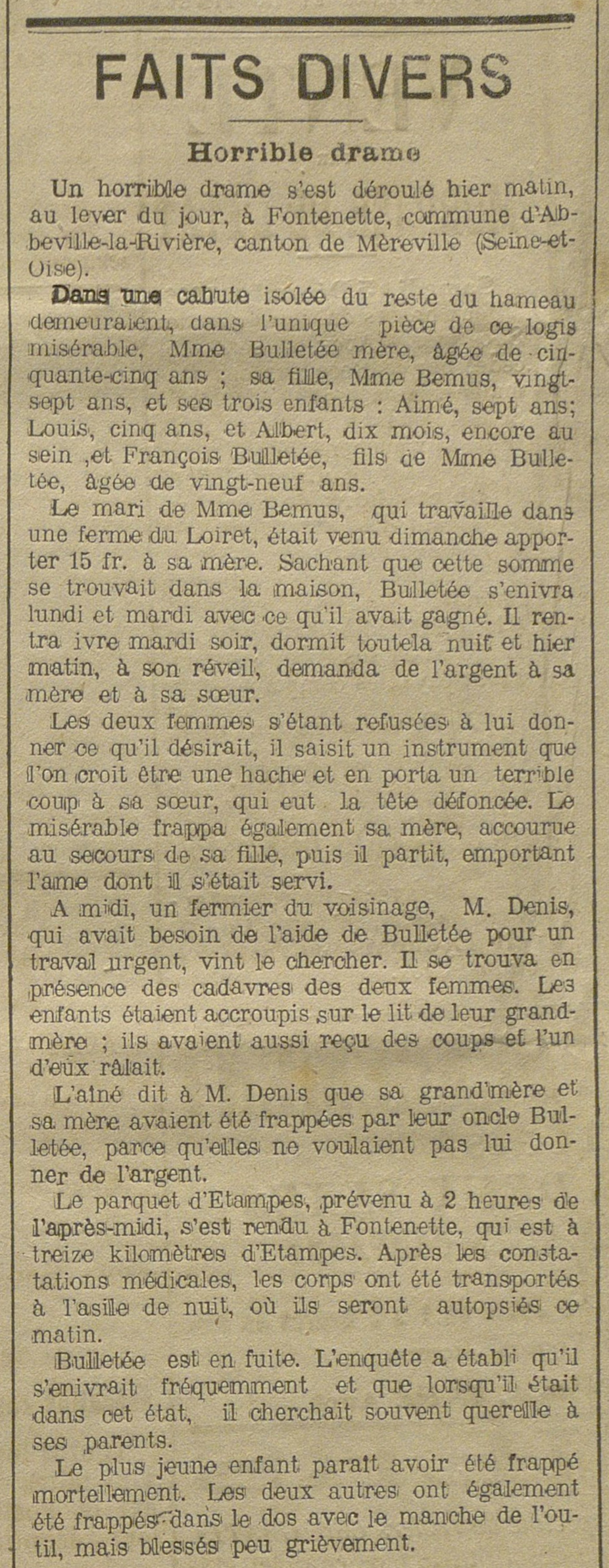 - Un horrible drame s'est déroulé hier matin, au lever du jour, à Fontenette, commune d'Abbeville-la-Rivière, canton de Mèreville [sic (Méréville)] (Seine-et-Oise).