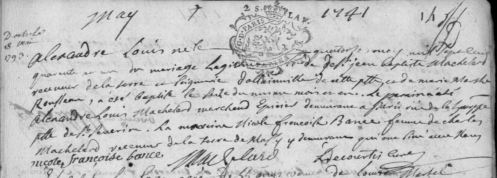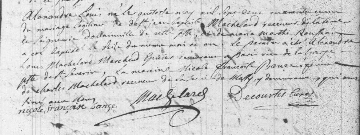 - Alexandre-Louis Machelard, né à Bruyères-le-Chastel le 14 mai 1741 et baptisé le surlendemain en son église Saint-Didier, était le fils posthume de Jean-Baptiste Machelard (1669-1741), en son vivant receveur de la terre et seigneurie d'Ollainville, et de sa veuve Marie-Marthe Rousseau (1714-1782), cultivatrice du comte de Rouhaud à Ollainville, paroisse de Bruyères-le-Chastel. Il eut pour parrain son oncle paternel autre Alexandre-Louis Machelard (1702-v.1771), marchand épicier à Paris.