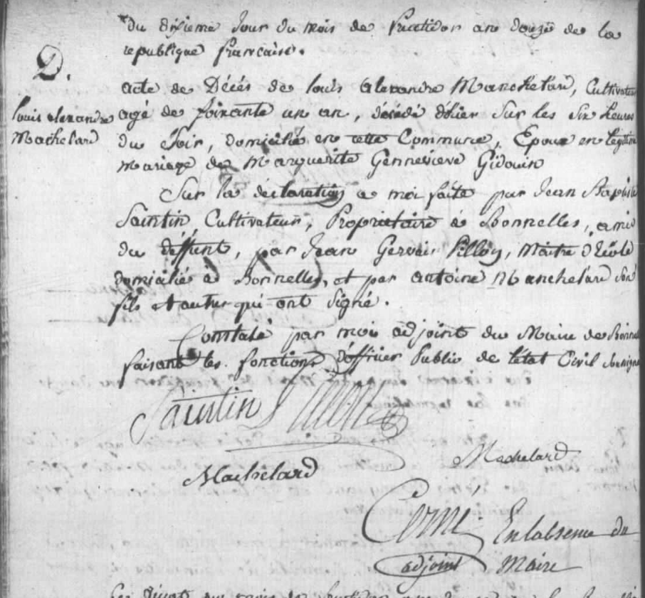 - Il mourut cultivateur à Bonnelles (Yvelines) le 9 fructidor an 12, c'est-à-dire le 27 août 1804, à l'âge de 63 ans.