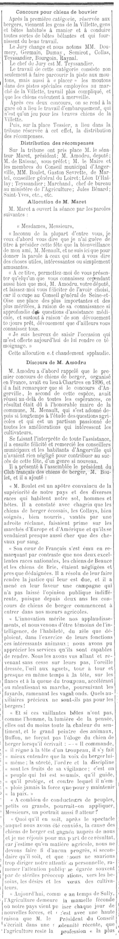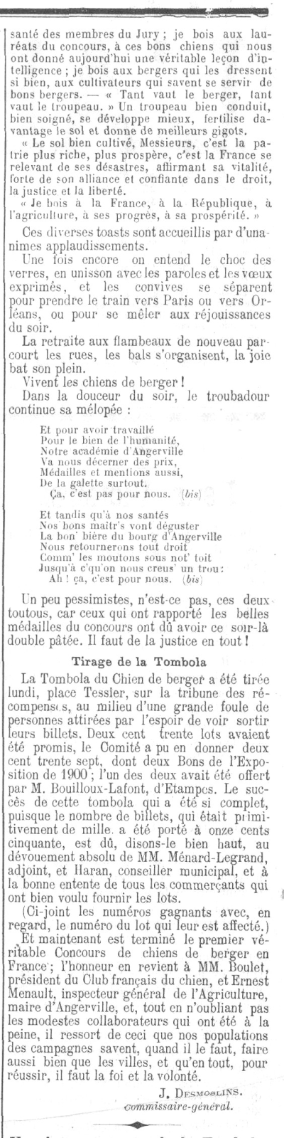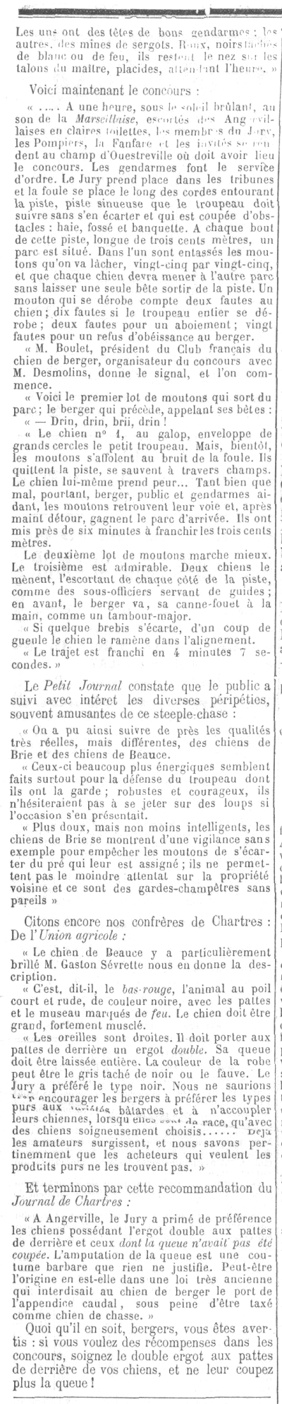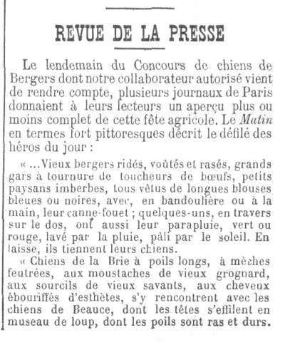 - J. Desmoulins (commissaire-général), “Concours de chiens de berger le 30 mai à Angerville”, L'Abeille d'Étampes 86/23 (5 juin 1897) 2.
