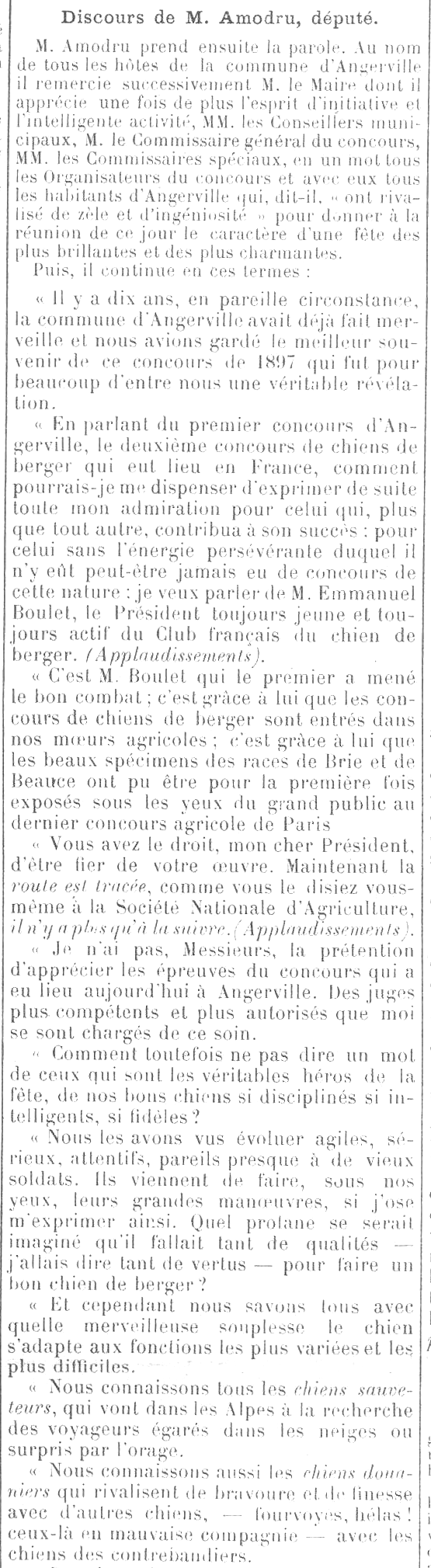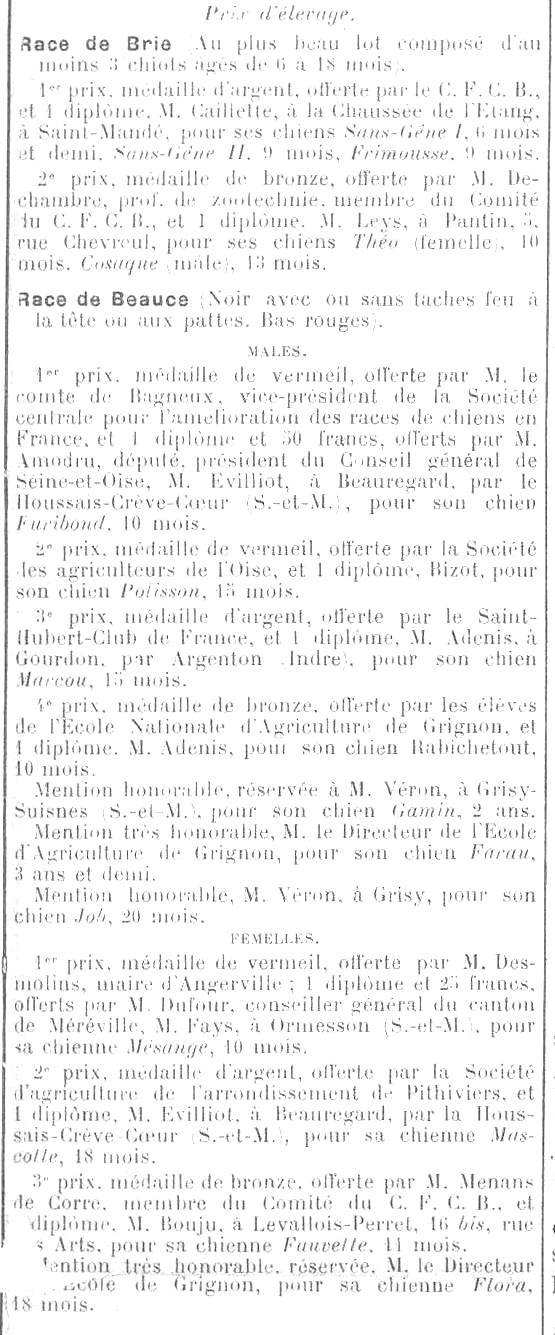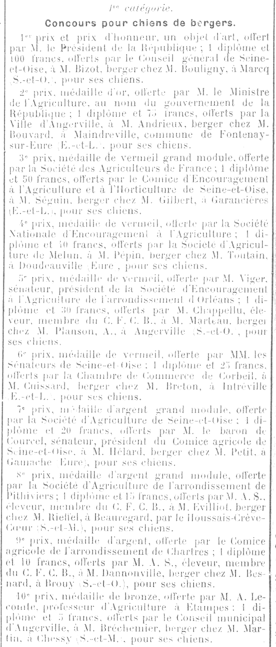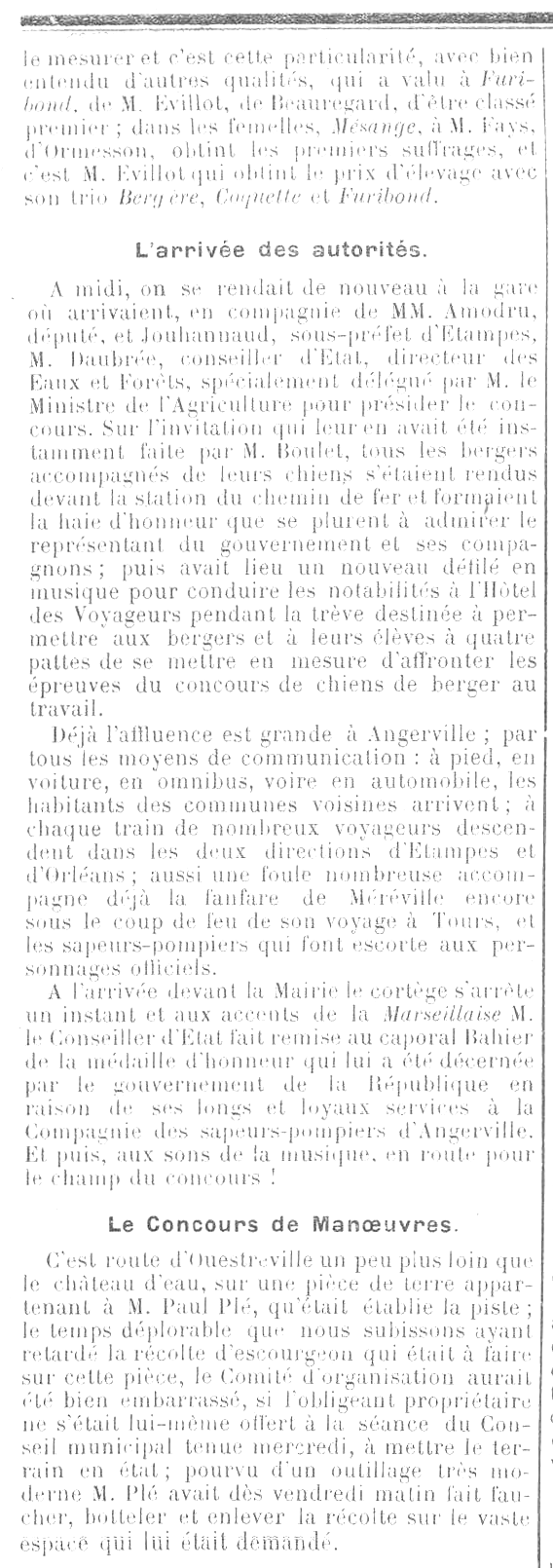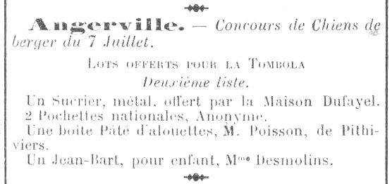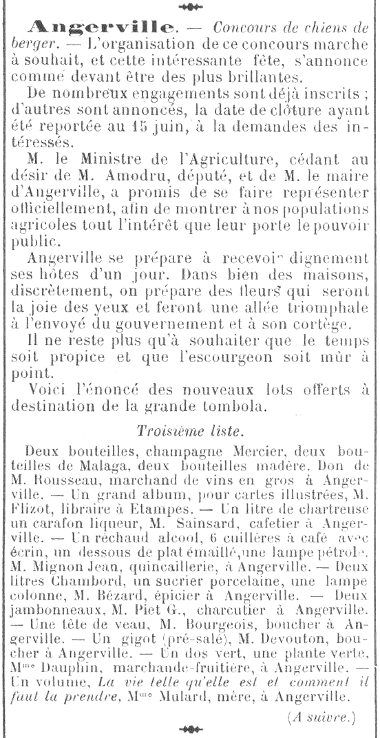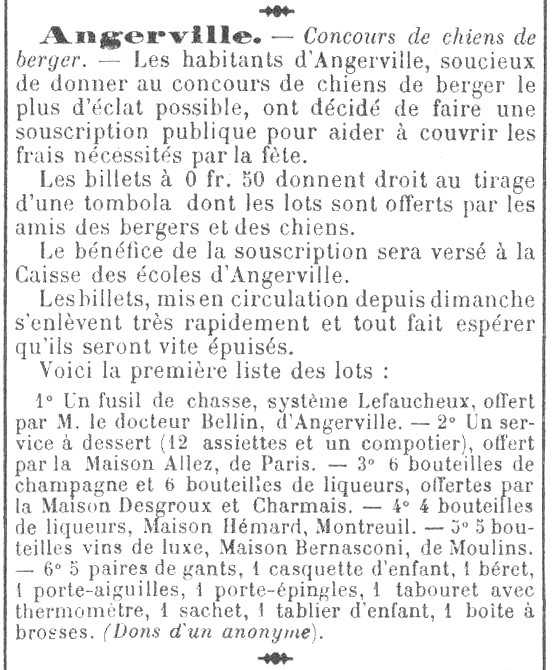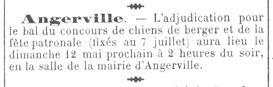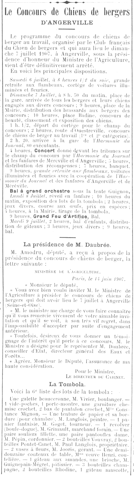 - Anonyme, “Le concours de chiens d'Angerville”, L'Abeille d'Étampes 96/17 (18 avril 1907) 2, 96/18 (25 avril 1907) 2, 96/19 (4 mai 1907) 2, 96/20 (18 mai 1907) 2, 96/21 (25 mai 1907) 2, 96/22 (1er juin 1907) 2, 96/23 (8 juin 1907) 2, 96/24 (15 juin 197) 2, 96/25 (22 juin 1907) 2, 96/26 (29 juin) 2, 96/27 (6 juillet) 2, 96/28 (13 juillet 1907) 1-3 et 96/28 (20 juillet 1907) 2.