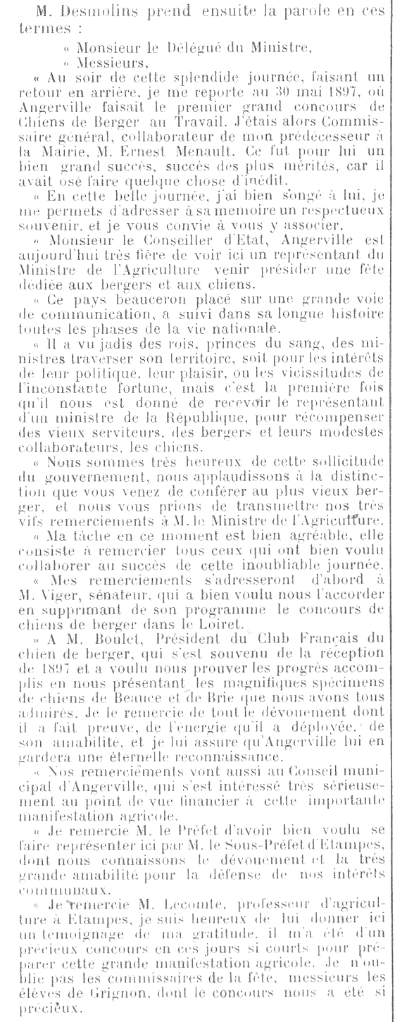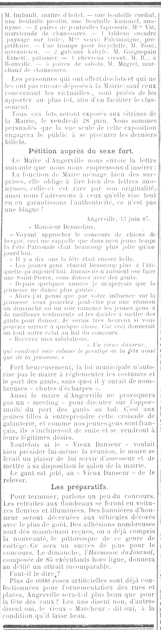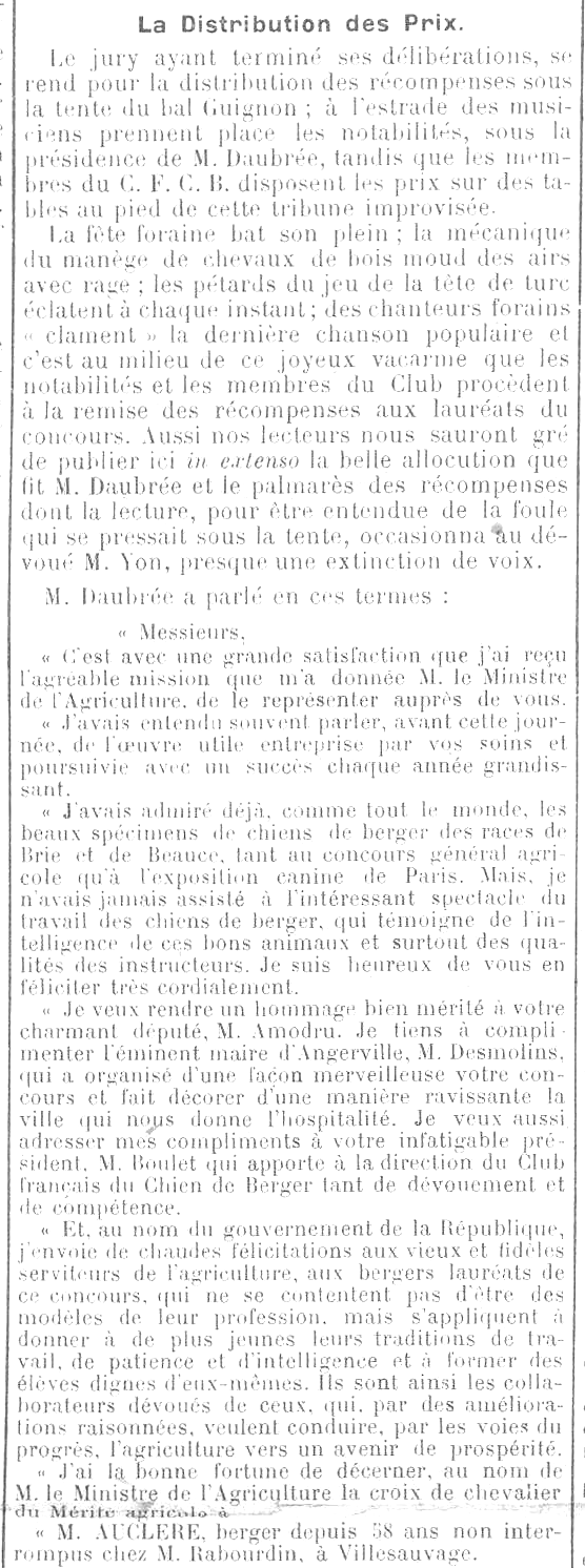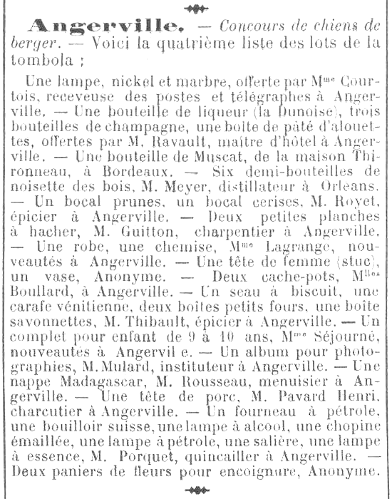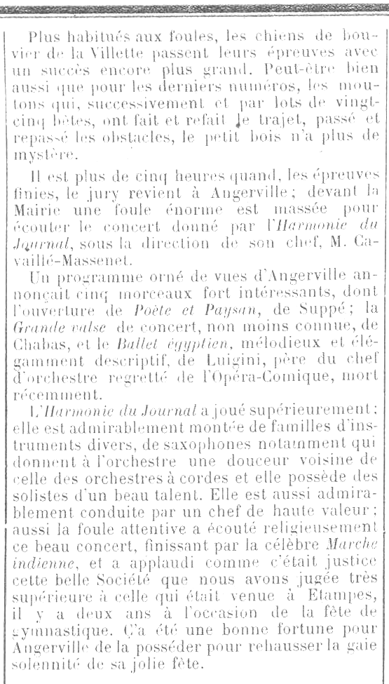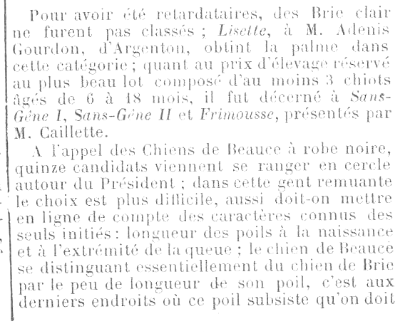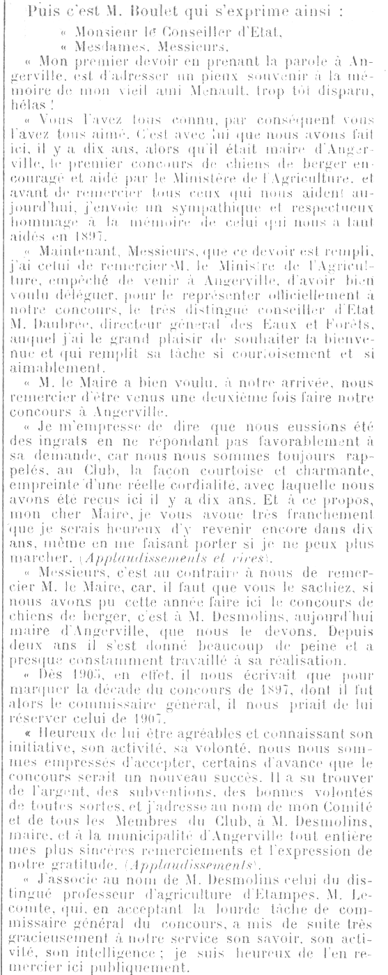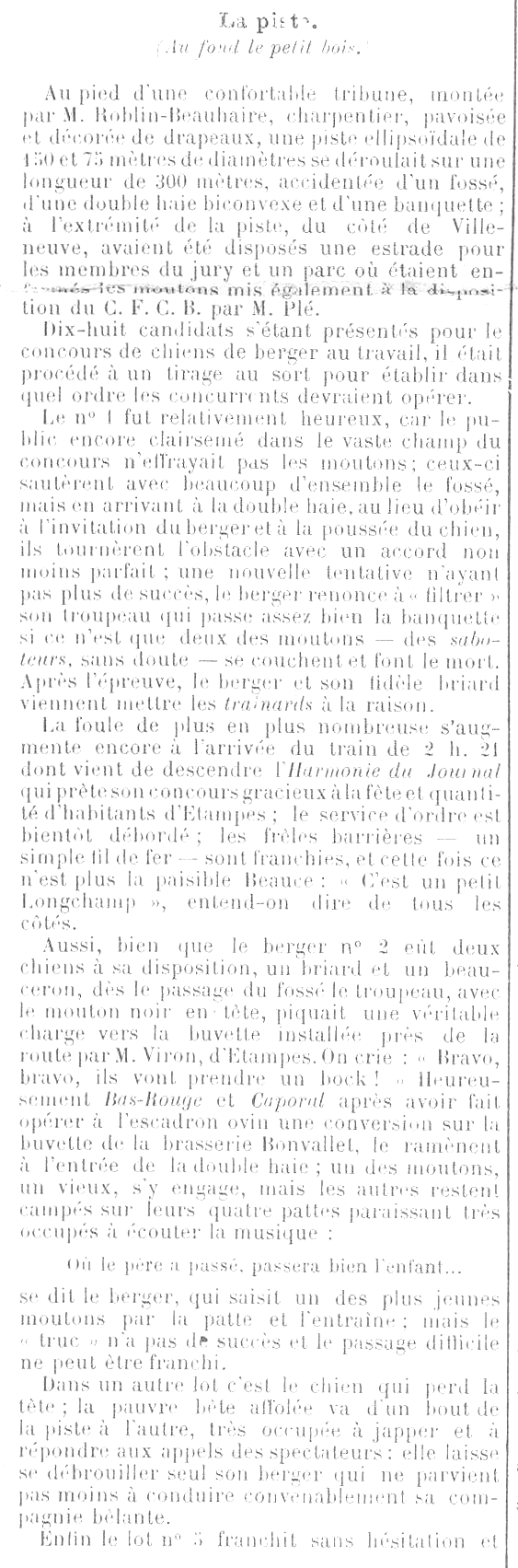 - Anonyme, “Le concours de chiens d'Angerville”, L'Abeille d'Étampes 96/17 (18 avril 1907) 2, 96/18 (25 avril 1907) 2, 96/19 (4 mai 1907) 2, 96/20 (18 mai 1907) 2, 96/21 (25 mai 1907) 2, 96/22 (1er juin 1907) 2, 96/23 (8 juin 1907) 2, 96/24 (15 juin 197) 2, 96/25 (22 juin 1907) 2, 96/26 (29 juin) 2, 96/27 (6 juillet) 2, 96/28 (13 juillet 1907) 1-3 et 96/28 (20 juillet 1907) 2.