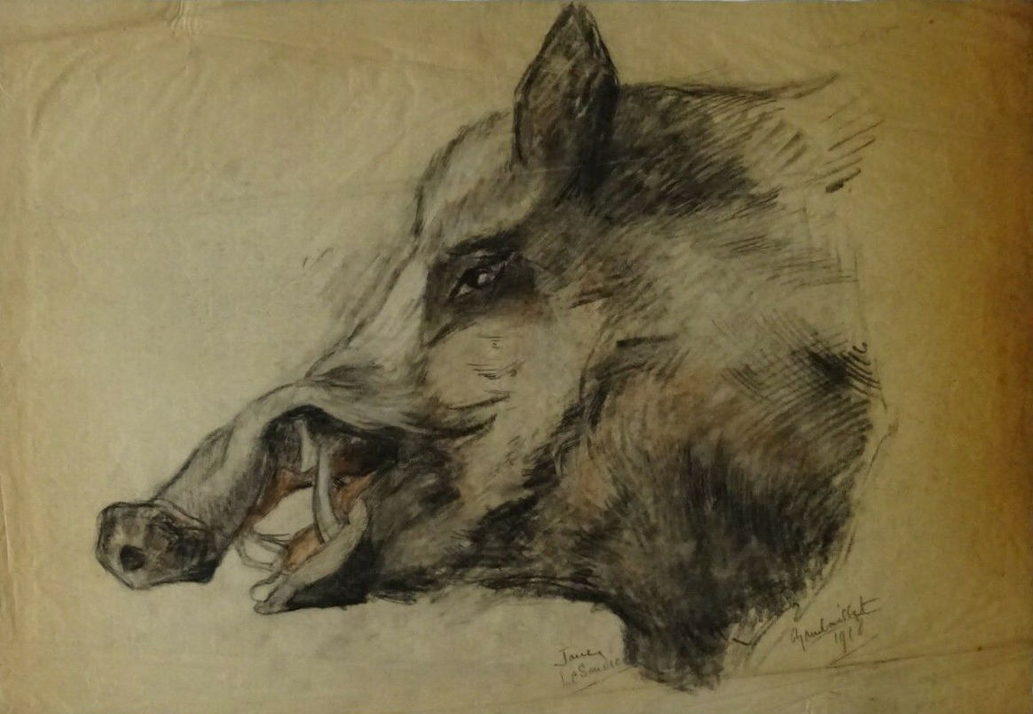 - Dessin sur calque représentant une tête de sanglier mort traitée au pastel et au fusain, signé “Jane Le Soudier” et daté “Rambouillet 1918”, dimension non précisées.