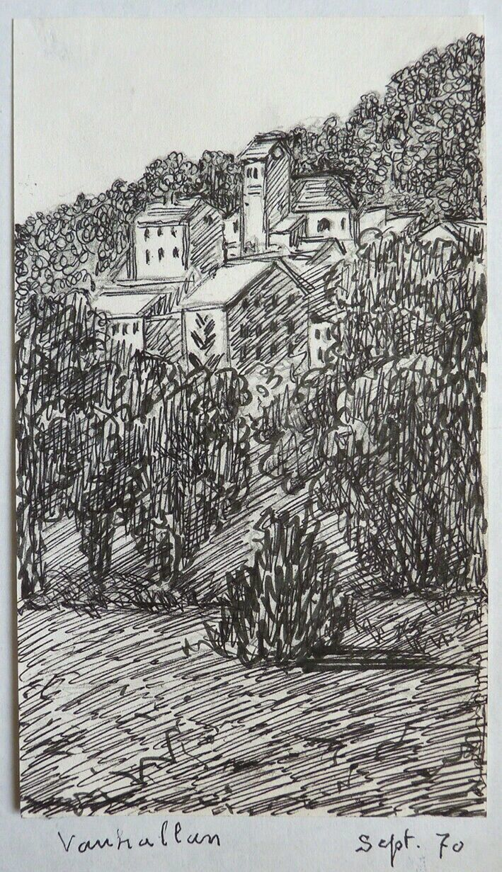 - Dessin du village de Vauhallan, à l'encre noire, peut-être au feutre, 17,5 cm sur 10, daté: “Vauhallan, sept. 1970”. L’œuvre n'est pas signée mais provient d'un lot de plusieurs dessins de sa main dont quelques-uns étaient bien pour leur part signés de son nom au témoignage du vendeur.