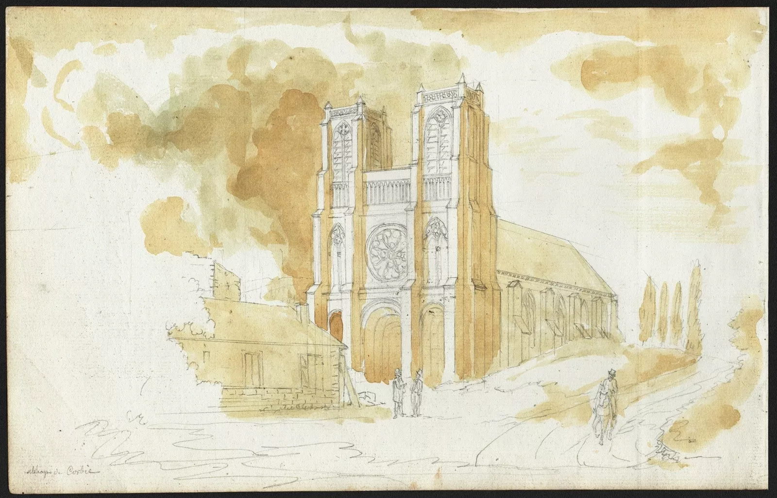- Au verso on trouve un dessin au crayon et lavis brun titré en bas à gauche: “abbaye de Corbie”.