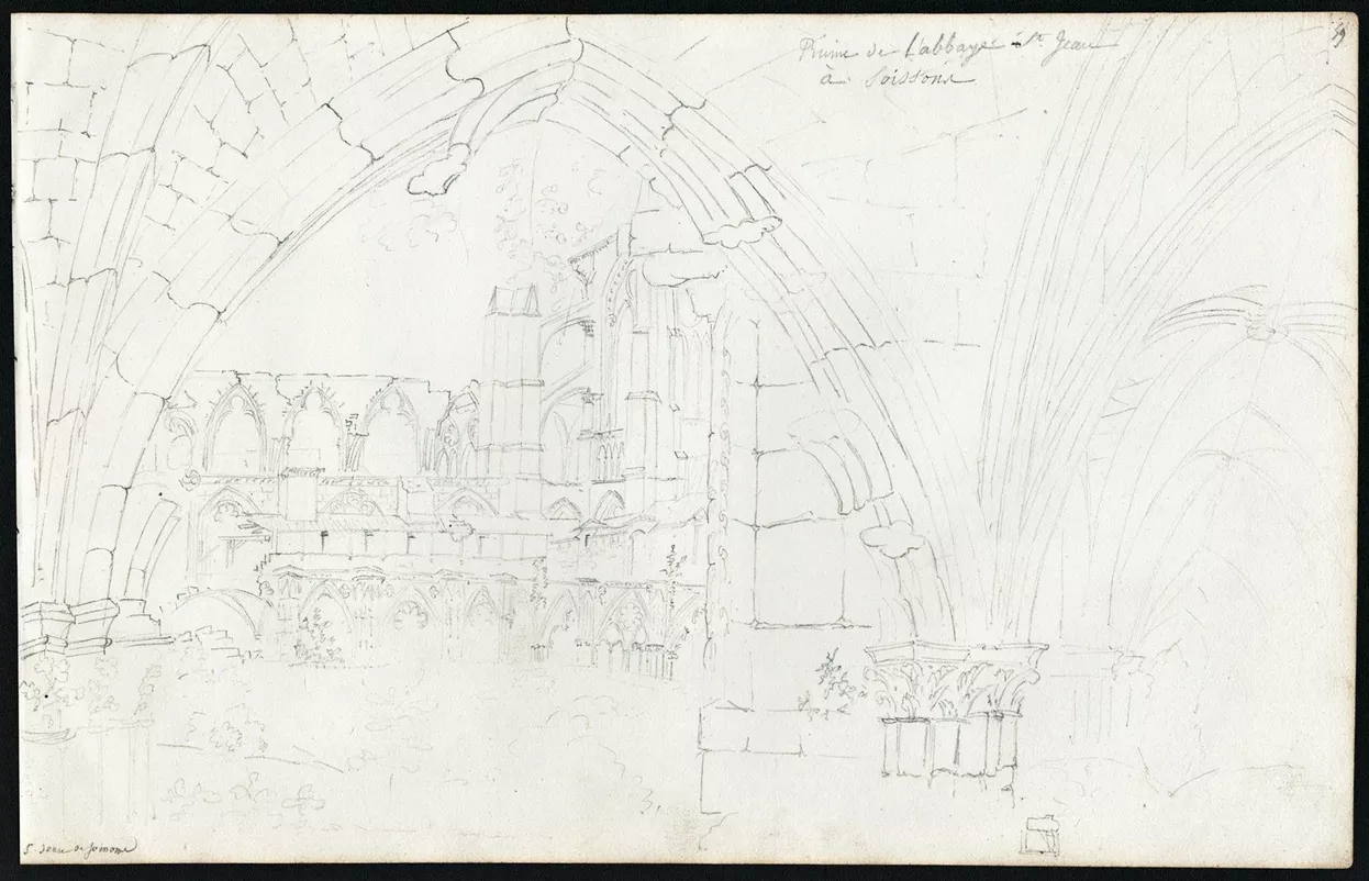 - Au verso on trouve un dessin au crayon titré en bas à gauche: “S. Jean de soissons” et en haut à droite: “Ruine de l'abbaye St Jean / à Soissons”, numéroté en haut à droite: “59”.