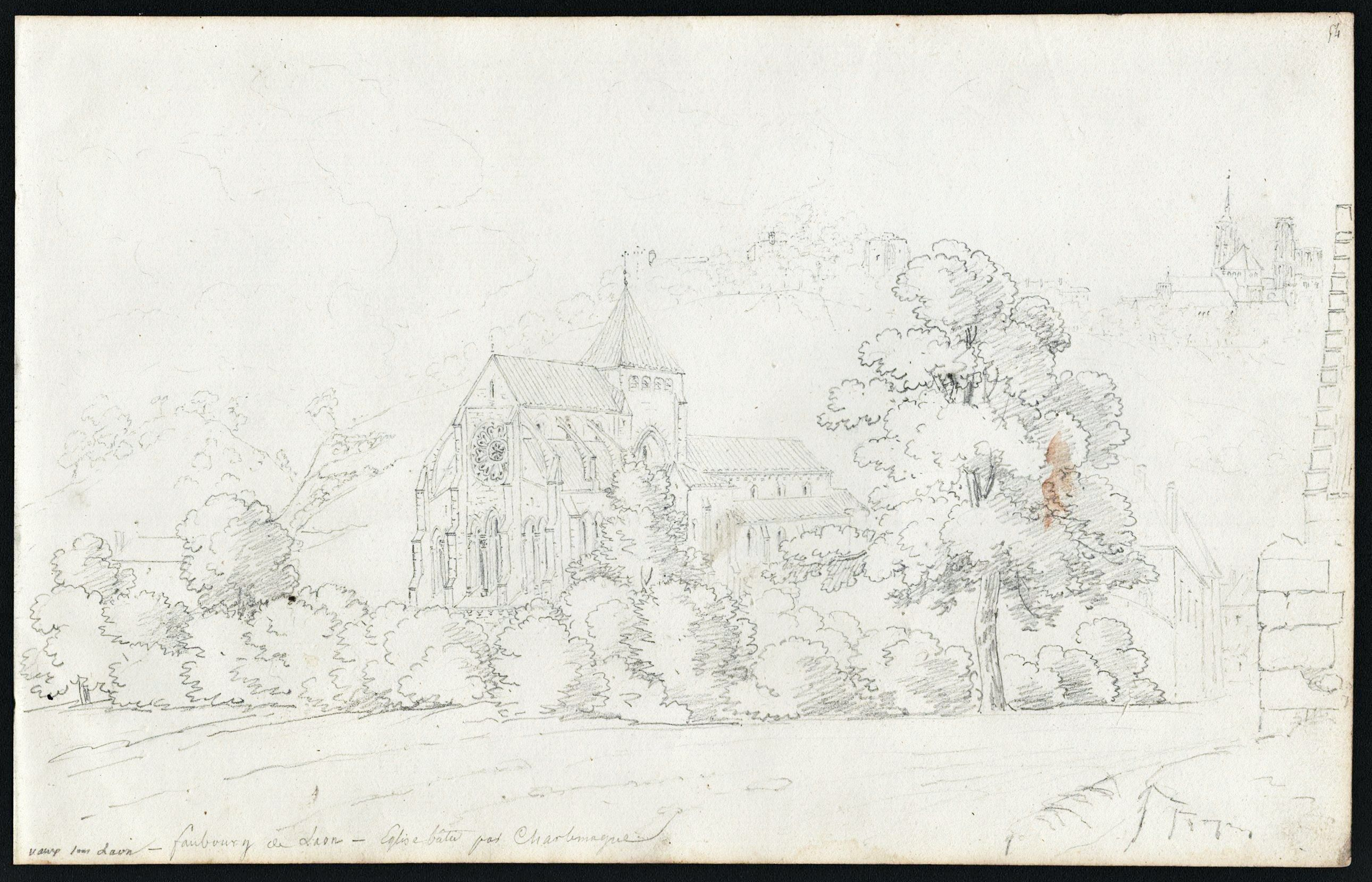 - Titré en bas à gauche: “vaux sous Laon” et ensuite d'une autre main: “faubourg de Laon - Eglise bâtie par Charlemagne”, numéroté en haut à droite: “54”.