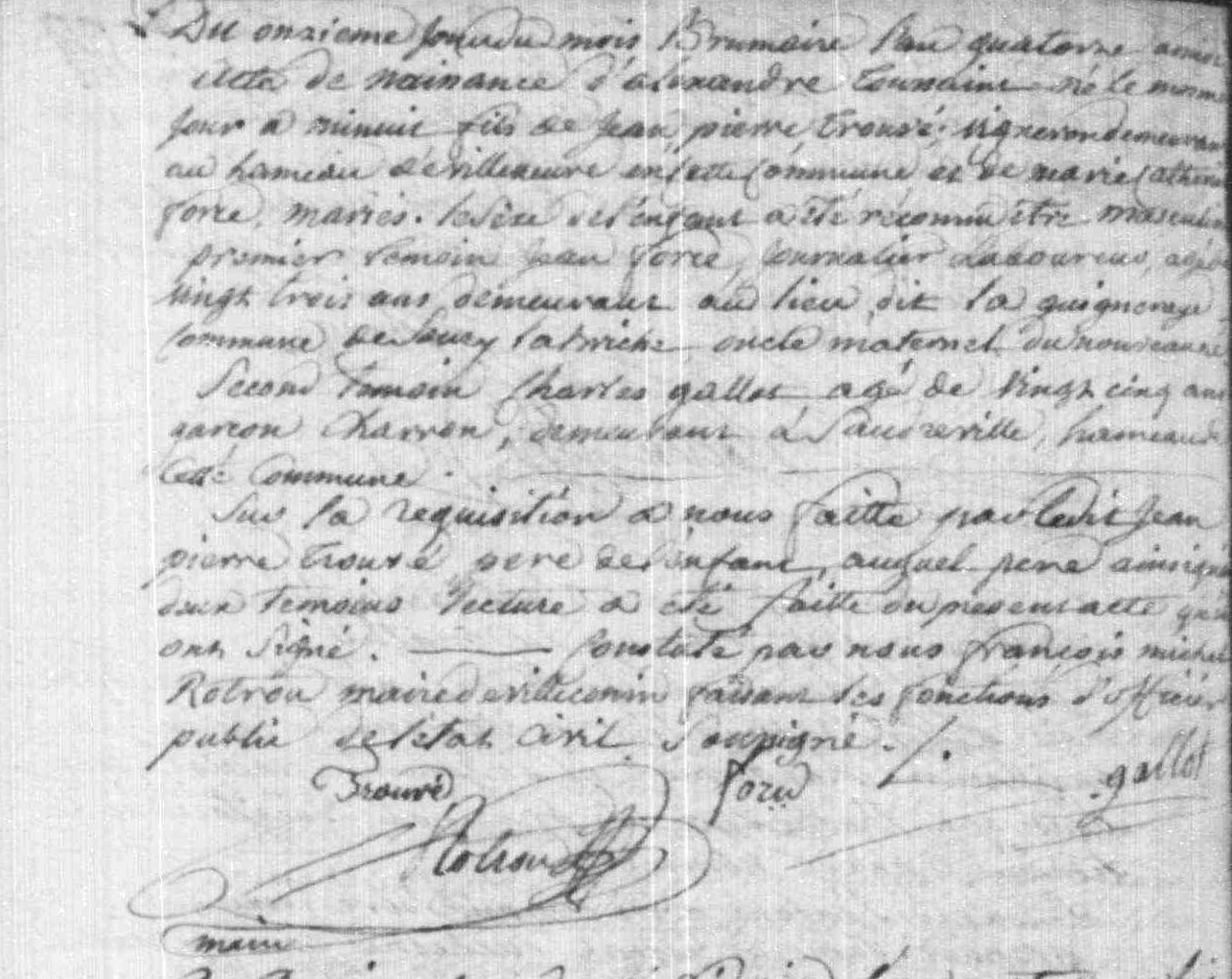 - Du mardi dix huit septembre mil huit cent soixante six, dix heures du matin. — Sont comparus devant nous Faustin Frédéric Barré adjoint spécialement délégué par le maire d'Etampes, officier public de l'état civil de la dite ville — le sieur Emile Trouvé, sans profession, âgé de vingt sept ans, demeurant avec ses père et mère, né à Etampes le vingt avril mil huit cent trente neuf, fils majeur de Toussaint Alexandre Trouvé, propriétaire, âgé de cinquante neuf ans, et de Marie Modeste Blin, son épouse, agée de cinquante un ans, domiciliés de cette ville rue Saint Jacques numéro soixante quatorze. — Et la demoiselle Louise Emelie Jousset, sans profession, agée de dix huit ans domiciliée de fait en cette ville rue de la Boucherie numéro onze chez son tuteur et de droit à Dossainville (Loiret) chez son aïeul maternel, née à Etampes le treize septembre mil huit cent quarante huit, fille mineur de feu Antoine Jérôme Jousset, décédé à Etampes le seize mars mil huit cent cinquante sept, et de feu Elise Césarine Joigneau son épouse, aussi décédée à Etampes le seize août mil huit cent quarante neuf. — Lesquels nous ont présenté leurs actes de naissance, les actes de décès des père et mère de la future, ceux aussi des décès des aïeuls paternel de la future, le consentement au présent mariage donné par l’aïeul maternel de la dite future par acte reçu devant maître Meneroy notaire à Etampes le trente août dernier, enregistré au dit lieu le trois septembre courant, et légalisé par monsieur le président du tribunal d'Etampes le cinq du dit mois de septembre, un certificat délivré par le même notaire le trente août dernier constatant que les futurs époux ont fait un contrat de mariage, et les actes de publication du présent mariage faits tant en cette ville qu'en la commune de Dossainville (Loiret) les dimanches deux et neuf septembre courant sans opposition. — Et après avoir visé pour être annexées le consentement au dit mariage, le certificat de contrat délivré par le notaire et les actes de publication, nous en avons donné lecture aux parties comparantes assistées de quatre témoins ci-après nommés et qualifiés, ainsi que du chapitre six du titre du mariage sur les droits et devoirs respectifs des époux. — Ensuite nous avons reçu la déclaration du sieur Emile Trouvé qu’il prend pour sa légitime épouse la demoiselle Louise Emelie Jousset, et celle de la demoiselle Louise Emelie Jousset qu'elle prend pour son légitime époux le sieur Emile Trouvé. — En conséquence nous nous avons déclaré au nom de la loi que le sieur Emile Trouvé et la demoiselle Louise Emelie Jousset sont unis par le mariage. — Tout ce que dessus fait à Etampes en l'hôtel de la mairie, les portes ouvertes, les dits jour, an et mois, et en présence et du consentement des père et mère de l'époux, et aussi en présence des sieurs Eugène Edmond Trouvé, propriétaire, agé de cinquante deux ans, oncle de l'époux, domicilié de cette ville, Edmond Eugène Trouvé, meunier, agé de trente ans, frère de l'époux, domicilié à Chevreuse (Seine et Oise), François Jousset, propriétaire, âgé de quarante huit ans, oncle de l'épouse, domicilié de cette ville, et Louis Jules Desroziers, clerc de notaire, agé de vingt quatre ans, cousin de l’époux, domicilié à Coulommiers (Seine et Marne), qui ont signé avec les époux et nous adjoint susnommé. — [Signé:] L. E. Jousset — Emile Trouvé — Trouvé — Blin — Eug. Trouvé — Ed. Trouvé — Jousset — Fréd. Barré adj.