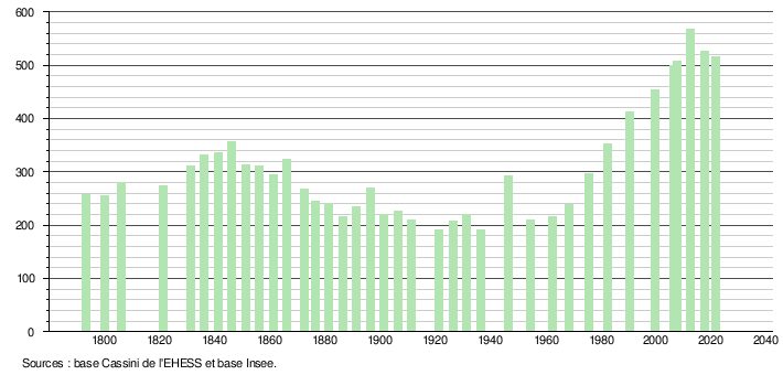 Sur la base de données empruntées, pour les années 1793-1999, au site du Laboratoire de Démographie et d'Histoire Sociale de l'EHESS, École des hautes études en sciences sociales; et, pour les années 2006 à 2021, au site de l'INSEE, Institut national de la statistique et des études économiques.