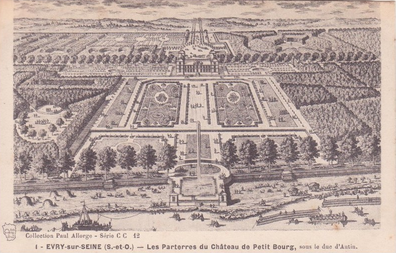 - Jean-Jacques Champin, “Village d'Évry et Parc de Petit Bourg” (lithographie à deux teintes), Paris, A. Collin, 1845.