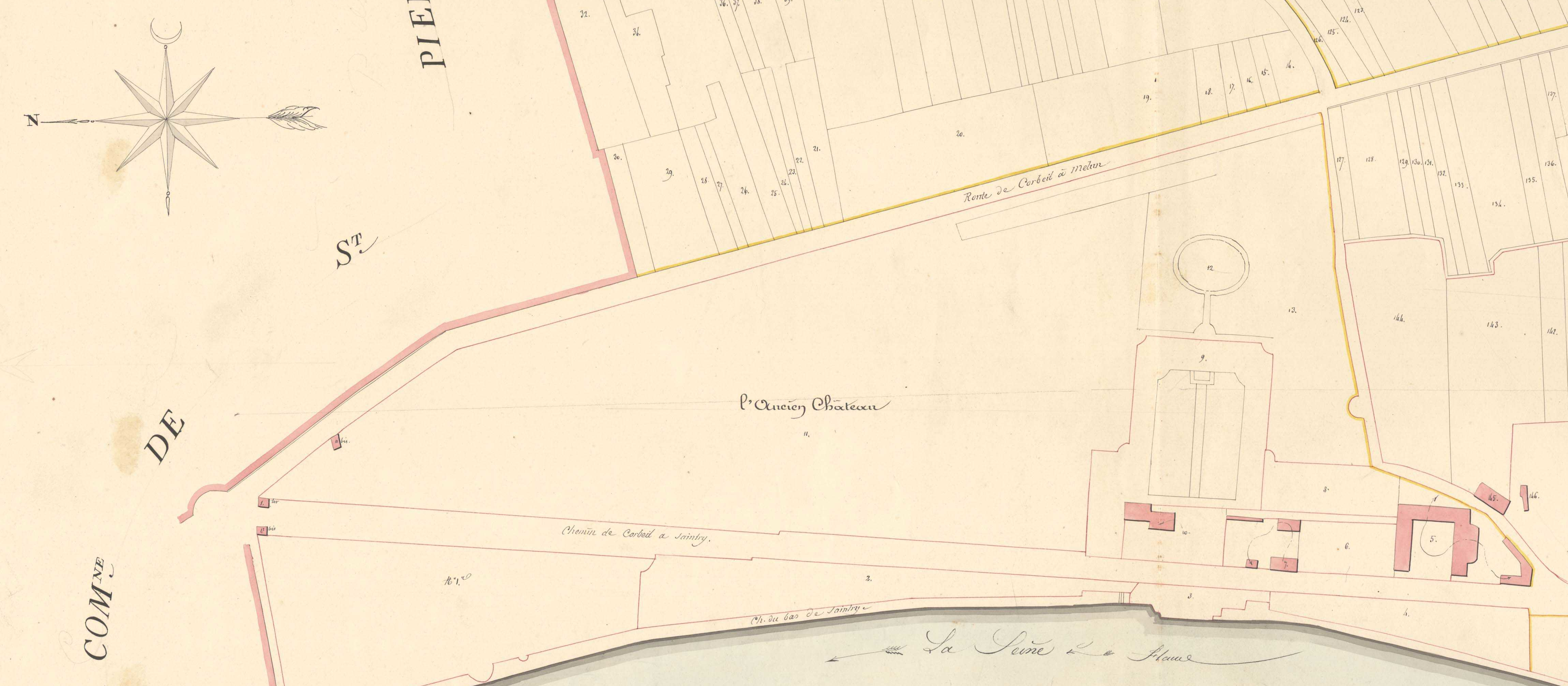 - Plan cadastral de Saintry, 1ère feuille de la section A, 1823, conservé aux Archives départementales de l'Essonne sous la cote 3P/1620.