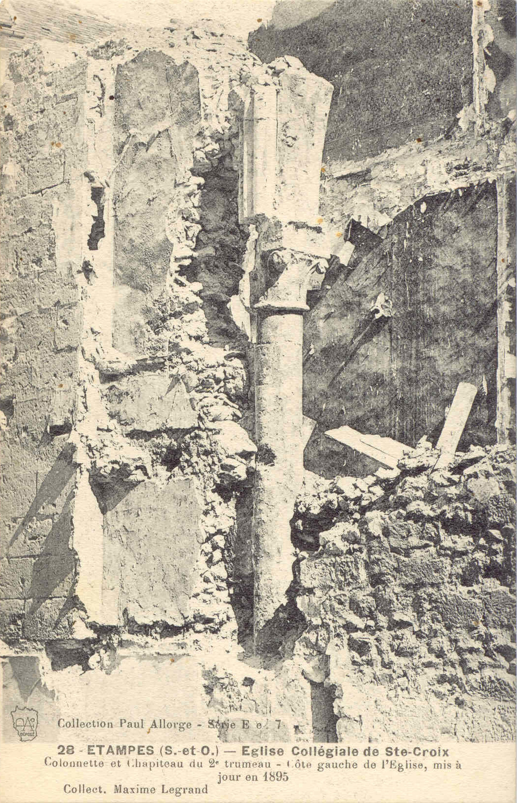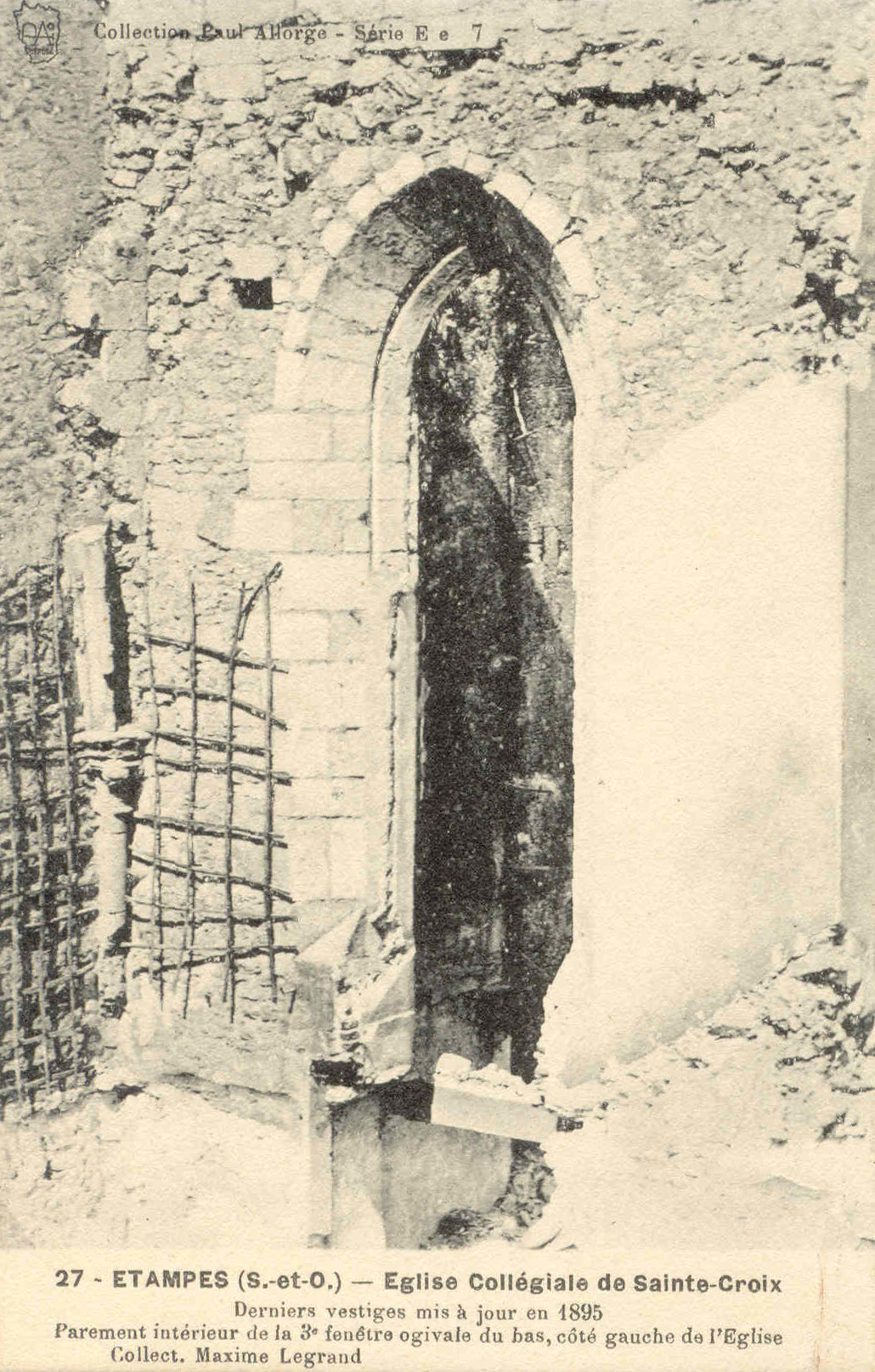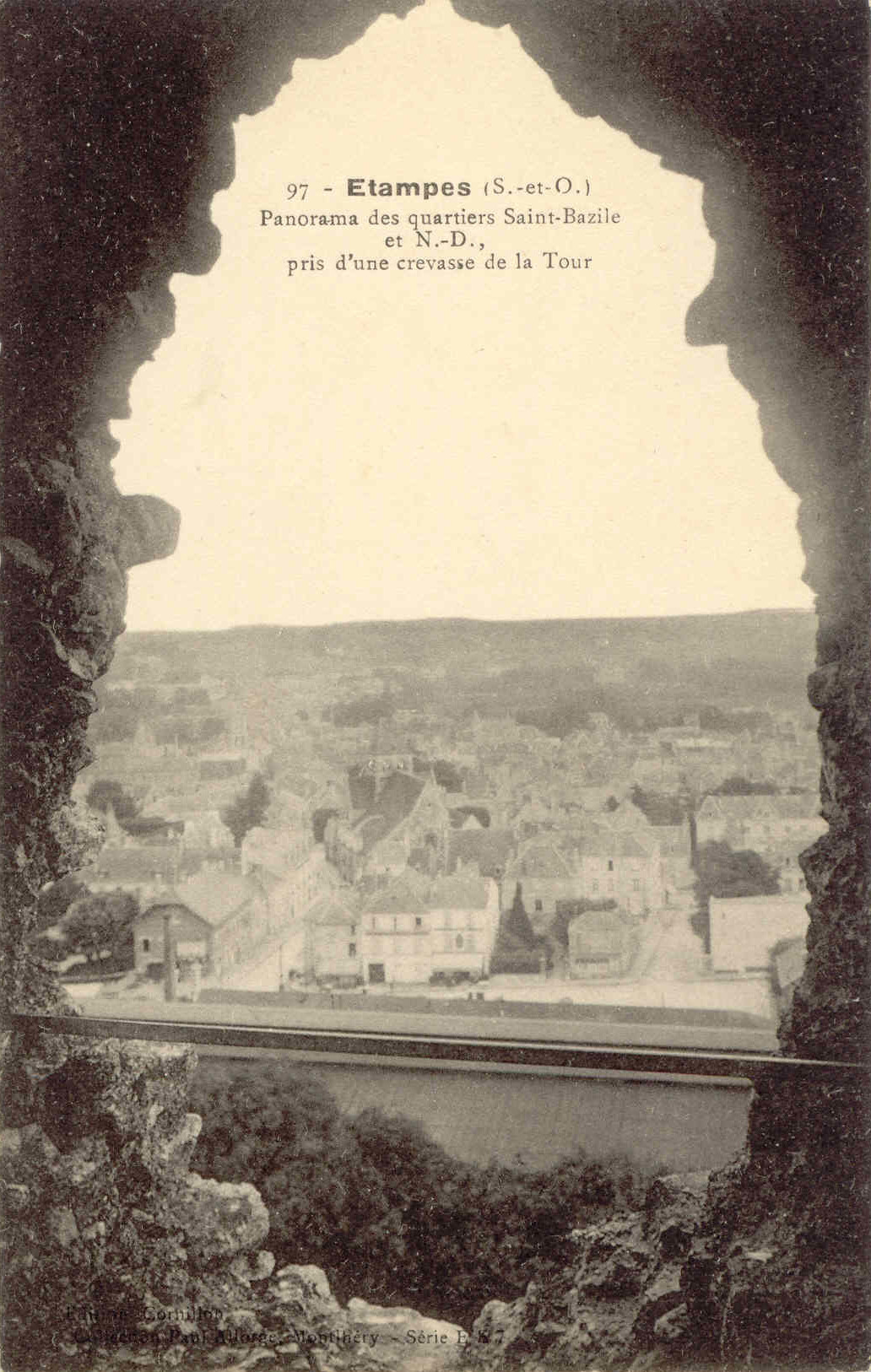 - C'est ainsi qu'il rangea toutes les cartes postales concernant Étampes dans la série “E e 7”, qui dans son esprit devait compter plus d'une centaine d'unités. Cependant, pour des raisons que nous ne connaissons pas, il ne parvint jamais à le compléter cette série-là, dont de nombreux numéros ne paraissent jamais avoir été édités. Pendant la Grande Guerre cependant il y ajouta quelques vues photographiques qui constituent aujourd'hui un précieux témoignage sur cette époque. Le revers des cartes postales suivantes semble indiquer que dans cette deuxième période il fit imprimer ses cartes à Paris par le phototypiste Baudinière.