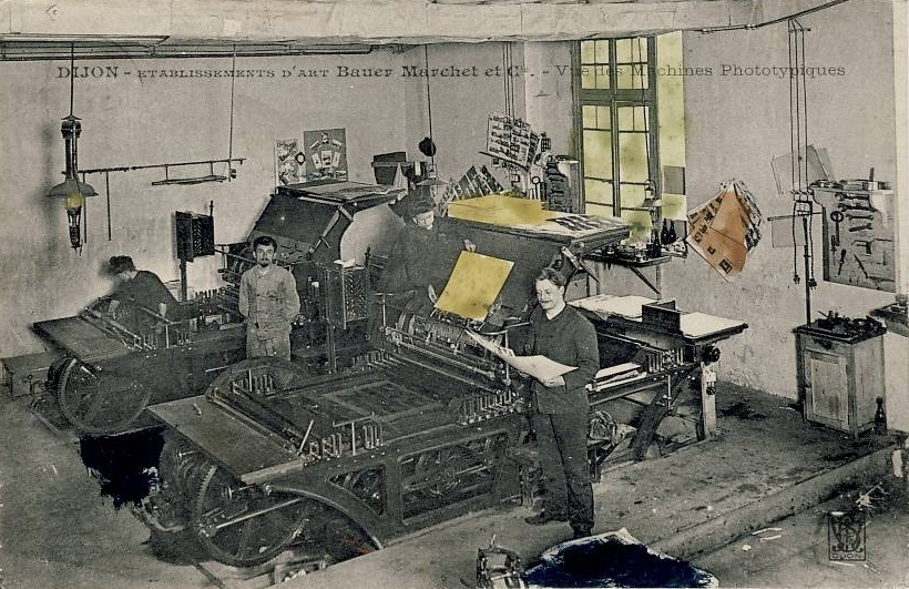- Il s'associe avant 1904 à la famille Marchet qui tient une imprimerie à Dijon depuis 1850 et forme ainsi avec eux l'Imprimerie d'art des Établissements Bauer, Marchet et Cie, dont les ateliers se trouvent à Dijon boulevard Voltaire, nos 1 à 3.