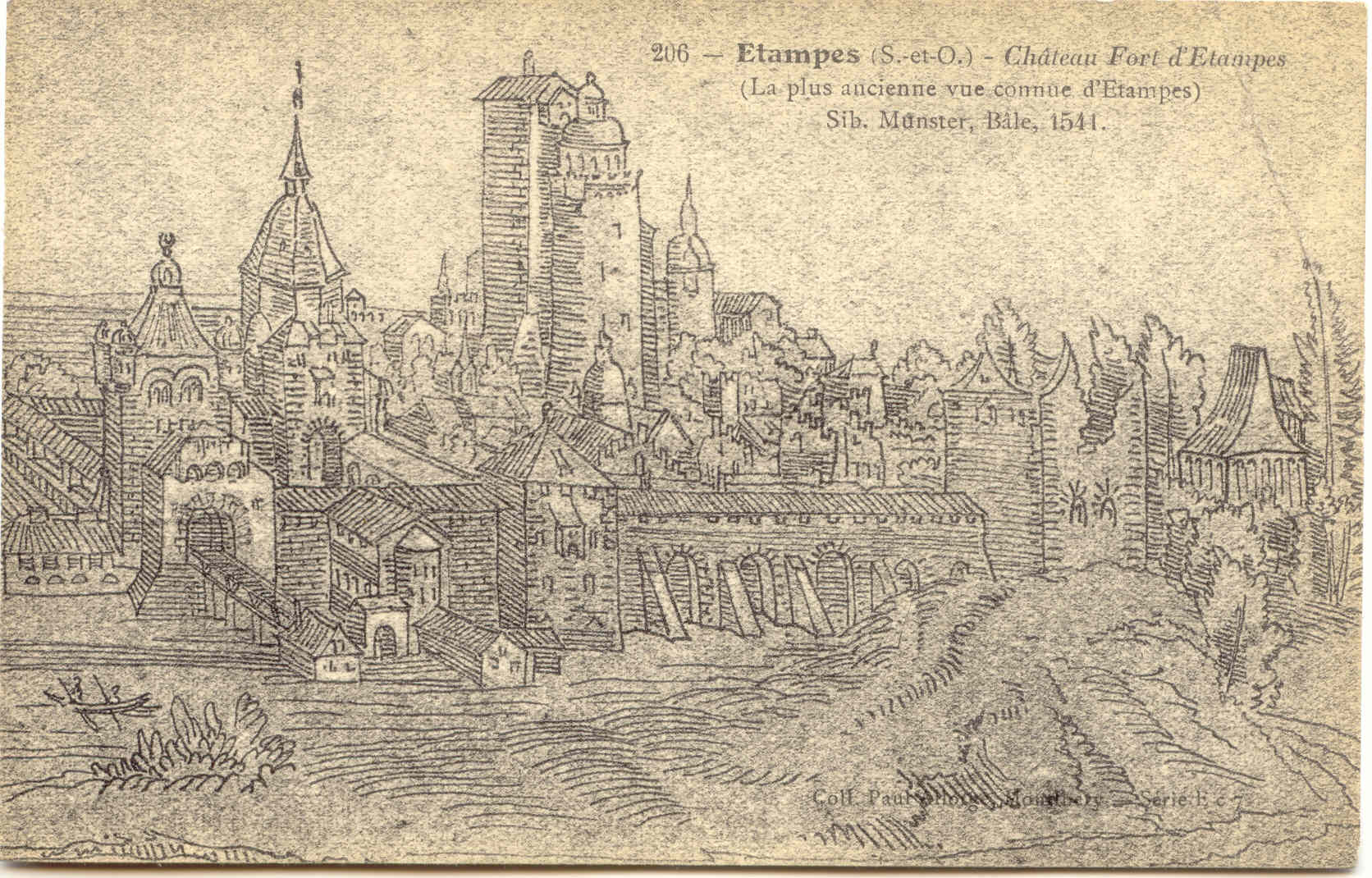 - 012. ÉTAMPES HISTORIQUE. Le Château-Fort Royal vers 1410-1415. Dessin inédit d'Albert Mayeux, d'après une miniature des Très-Riches Heures du duc de Berry [La gravure est signée:] Albert Mayeux, 1912.