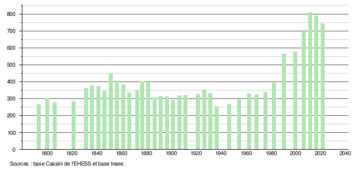 Sur la base de données empruntées, pour les années 1793-1999, au site du Laboratoire de Démographie et d'Histoire Sociale de l'EHESS, École des hautes études en sciences sociales; et, pour les années 2006 à 2021, au site de l'INSEE, Institut national de la statistique et des études économiques.