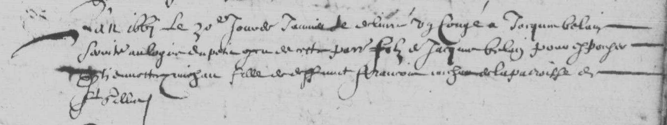 - Transcription. — L'an 1661 le 30e jour de janvier jé [j'ai] delivré un congé à Jacques Belain serviteur au logis du Petit Escu de cete parroisse, filz de Jacques Belain, pour espouser Estiennette Michau fille de deffunct François Michau de la parroisse de Saint Gilles.