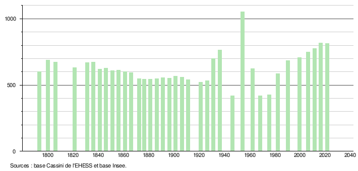 Sur la base de données empruntées, pour les années 1793-1999, au site du Laboratoire de Démographie et d'Histoire Sociale de l'EHESS, École des hautes études en sciences sociales; et, pour les années 2006 à 2021, au site de l'INSEE, Institut national de la statistique et des études économiques.