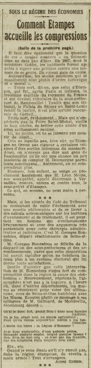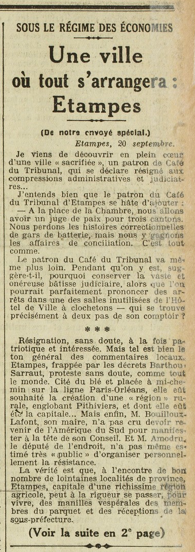 - André Guérin, “Sous le régime des économies. Une ville où tout s'arrangera: Étampes”, L'Œuvre 4008 (21 septembre 1926) 1-2.