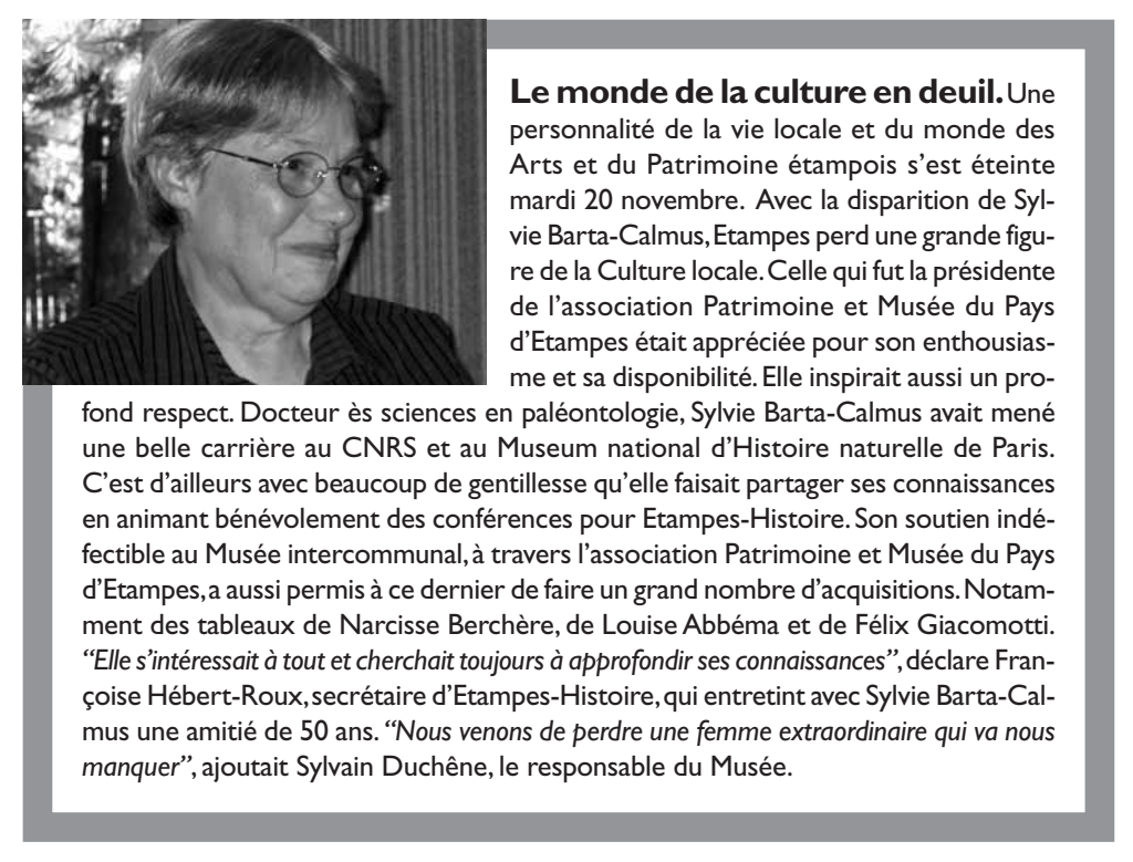 - Le monde de la culture en deuil. Une personnalité de la vie locale et du monde des Arts et du Patrimoine étampois s’est éteinte mardi 20 novembre. Avec la disparition de Sylvie Barta-Calmus, Étampes perd une grande figure de la Culture locale. Celle qui fut la présidente de l'association Patrimoine et Musée du Pays d'Étampes était appréciée pour son enthousiasme et sa disponibilité. Elle inspirait aussi un profond respect. Docteur ès sciences en paléontologie, Sylvie Barta-Calmus avait mené une belle carrière au CNRS et au Museum national d'Histoire naturelle de Paris. C’est d'ailleurs avec beaucoup de gentillesse qu'elle faisait partager ses connaissances en animant bénévolement des conférences pour Étampes-Histoire. Son soutien indéfectible au Musée intercommunal, à travers l'association Patrimoine et Musée du Pays d'Étampes, a aussi permis à ce dernier de faire un grand nombre d'acquisitions. Notamment des tableaux de Narcisse Berchère, de Louise Abbéma et de Félix Giacomotti. “Elle s'intéressait à tout et cherchait toujours à approfondir ses connaissances”, déclare Françoise Hébert-Roux, secrétaire d'Étampes-Histoire, qui entretint avec Sylvie Barta-Calmus une amitié de 50 ans. “Nous venons de perdre une femme extraordinaire qui va nous manquer”, ajoutait Sylvain Duchêne, le responsable du Musée.