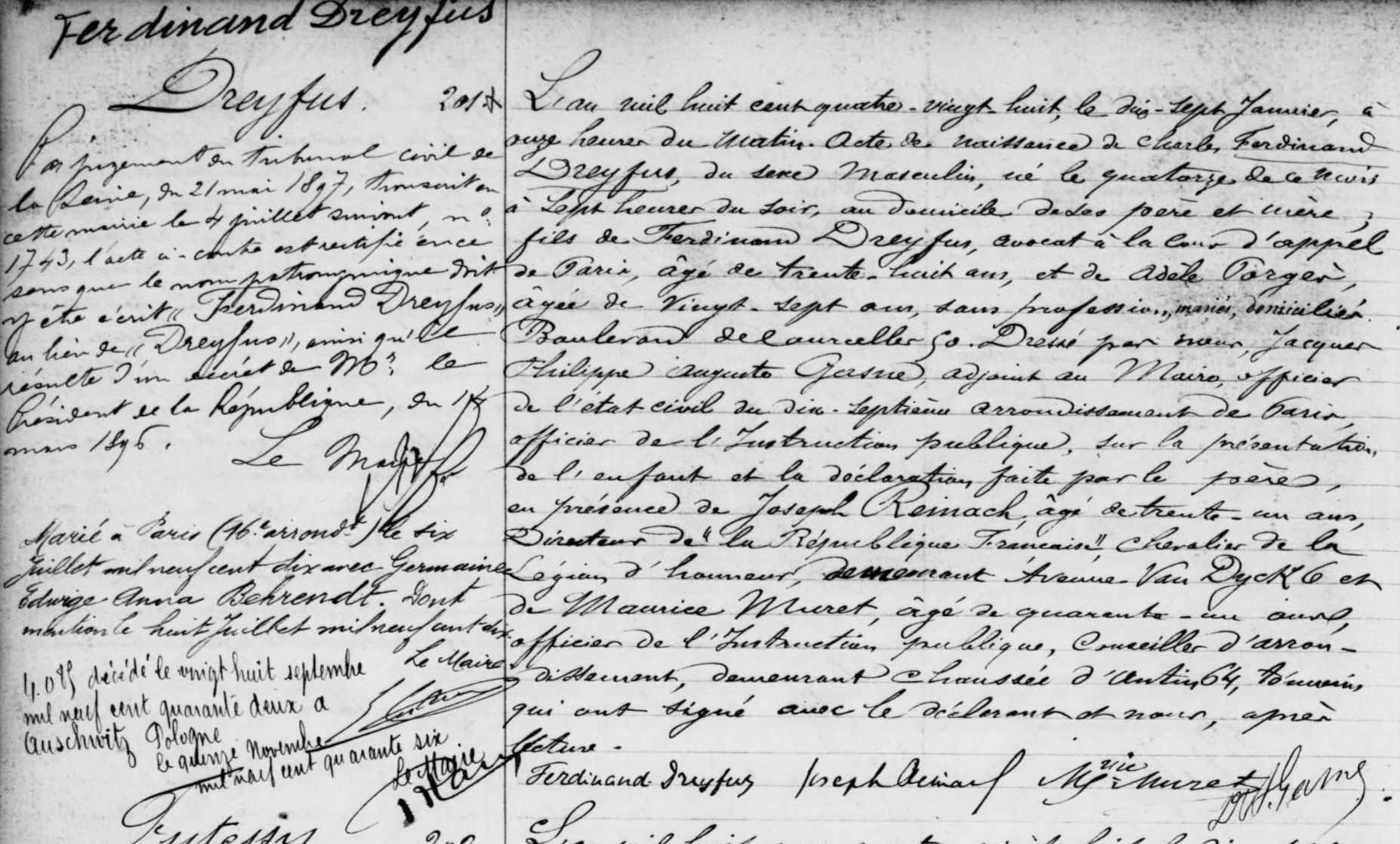 - Ferdinand-Dreyfus (Charles), né le 14 janvier 1888 à Paris (17e) (Seine), décédé le 28 septembre 1942 à Auschwitz (Pologne). (…)