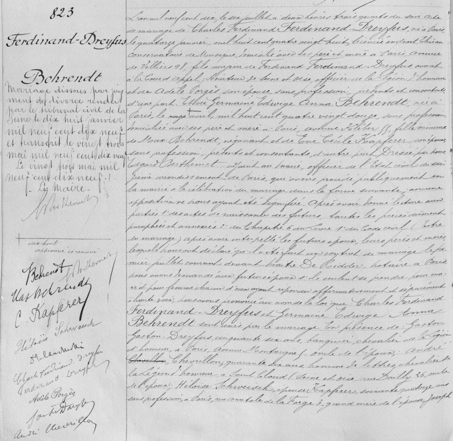 - “Mariage dissous par jugement de divorce rendu par le tribunal civil de la Seine le dix huit janvier mil neuf cent dix neuf” (jugement transcrit en marge de l'acte de mariage du 6 juillet 1910).