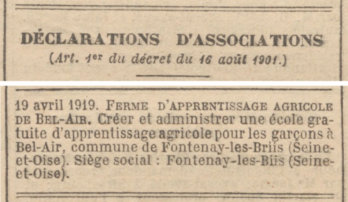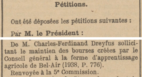 - Si en publiant ces divers renseignements, nous parvenons à aider la Ferme d'apprentissage agricole de Bel-Air, à compléter son effectif de trente apprentis pour le premier octobre prochain, nous serons heureux d'avoir apporté un faible concours à une œuvre qui honore le nom de notre regretté Sénateur, Ferdinand-Dreyfus.