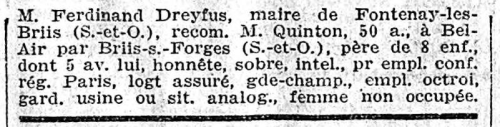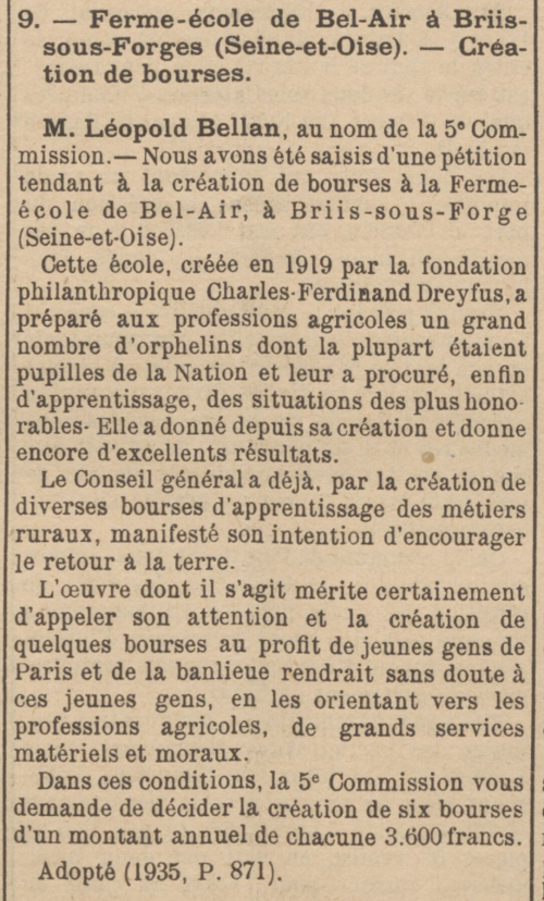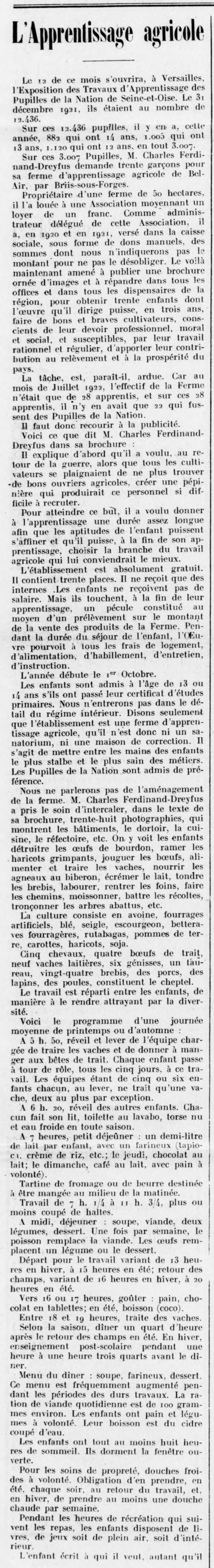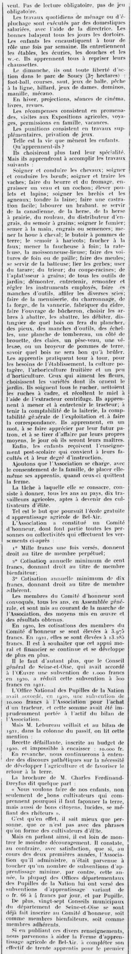 - Sur ces 3.007 Pupilles, M. Charles Ferdinand-Dreyfus demande trente garçons pour sa ferme d’apprentissage agricole de Bel-Air, par Briis-sous-Forges.