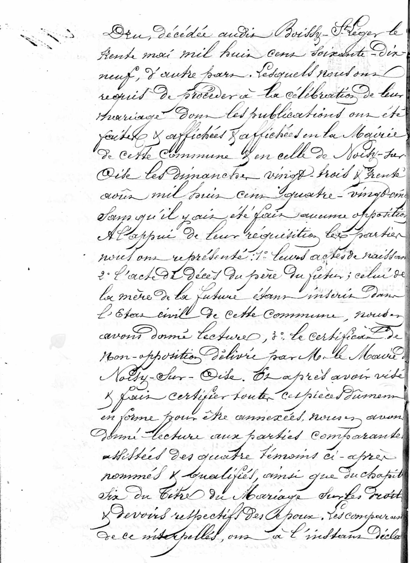 - Lesquels nous ont requis de procéder à la célébration du mariage, dont les publications ont été faites et affichées à la mairie de cette commune et en celle de Noisy-sur-Oise les dimanches 23 et 30 août 1885, sans qu'il y ait été fait aucune opposition.