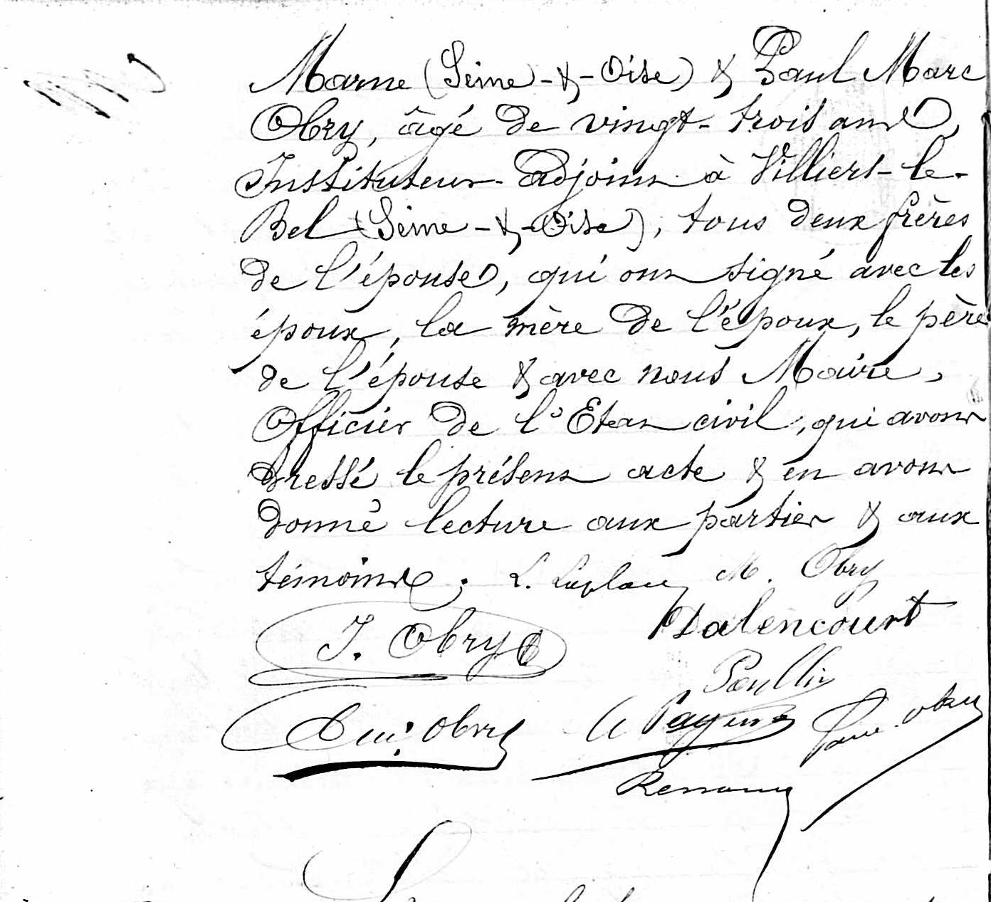 - Tout ce que dessus fait publiquement dans la maison commune en présence de MM. Alfred Poullin, âgé de trente-neuf, 39 ans, cultivateur, maire de Noisy-sur-Oise, ami de l'époux ; Carolus Payen, âgé de trente ans, instituteur à Luzarches (Seine-et-Oise), ami de l'époux et beau-frère de l'épouse ; Jules Émile Obry, âgé de trente trois ans, instituteur à Chennevières-sur-Marne (Seine-et-Oise) et Paul Marc Obry, âgé de vingt-trois ans, instituteur adjoint à Villiers-le-Bel (Seine-et-Oise), tous deux frères de l'épouse, qui ont signé avec les époux, la mère de l'époux, le père de l'épouse et nous Maire, officier de l'état civil, qui avons dressé le présent acte et en avons donné lecture aux parties et témoins.