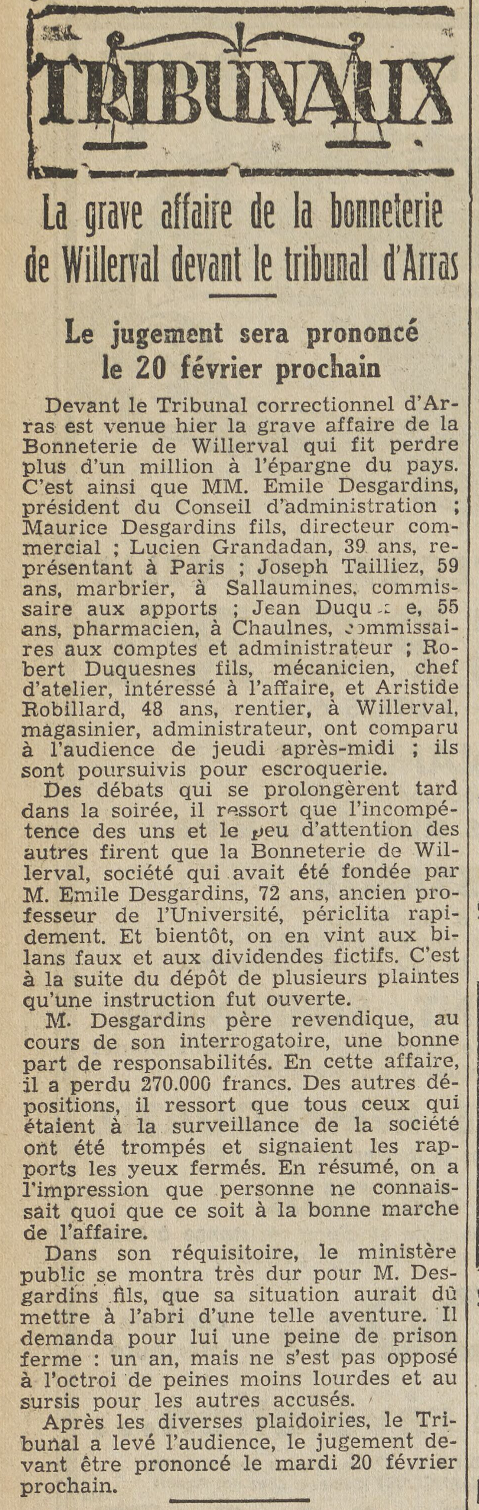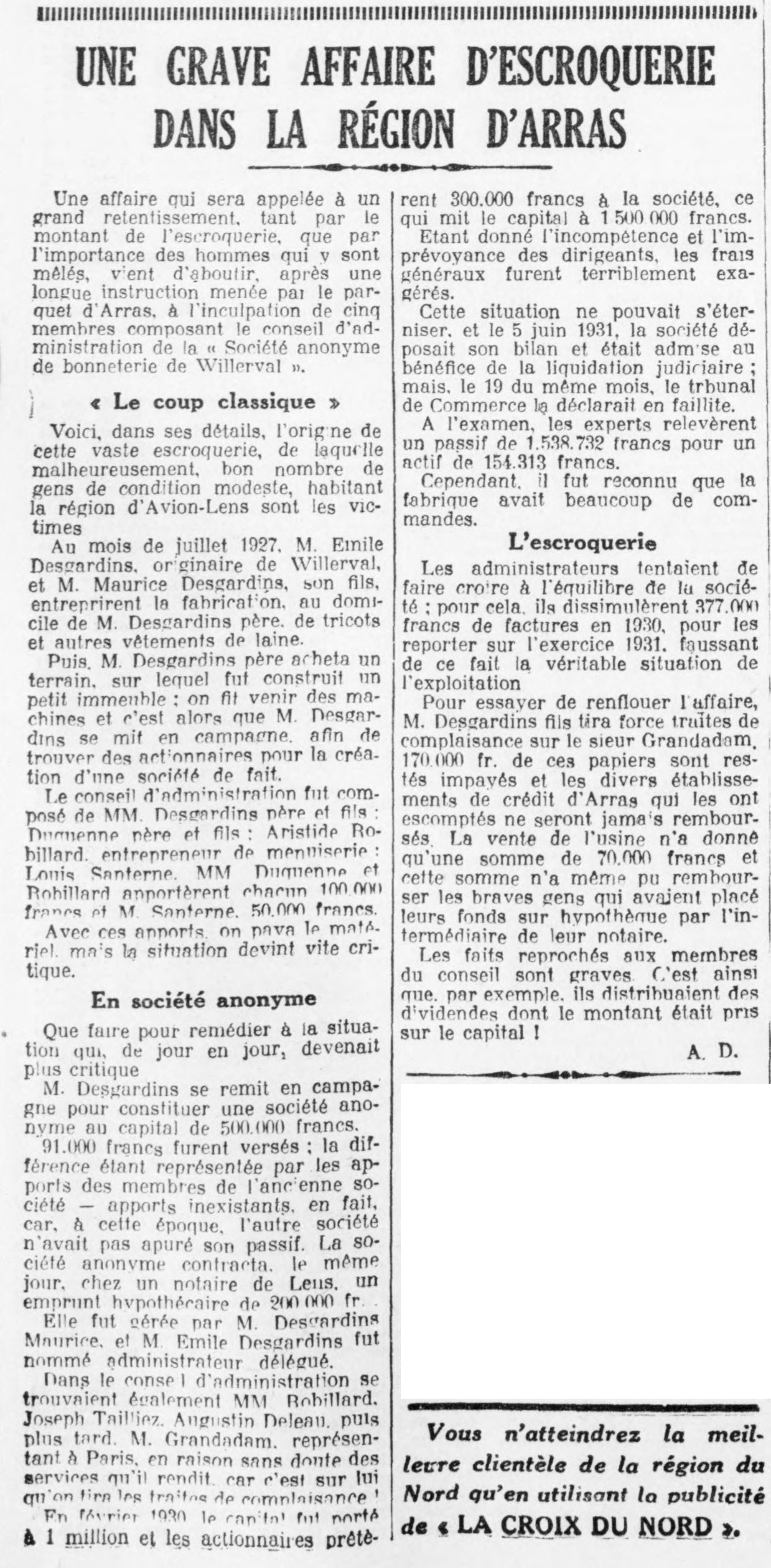 - A. D., “Une grave affaire d'escroquerie dans la région d'Arras”, La Croix du Nord 45/12994 (3 décembre 1933) 5.