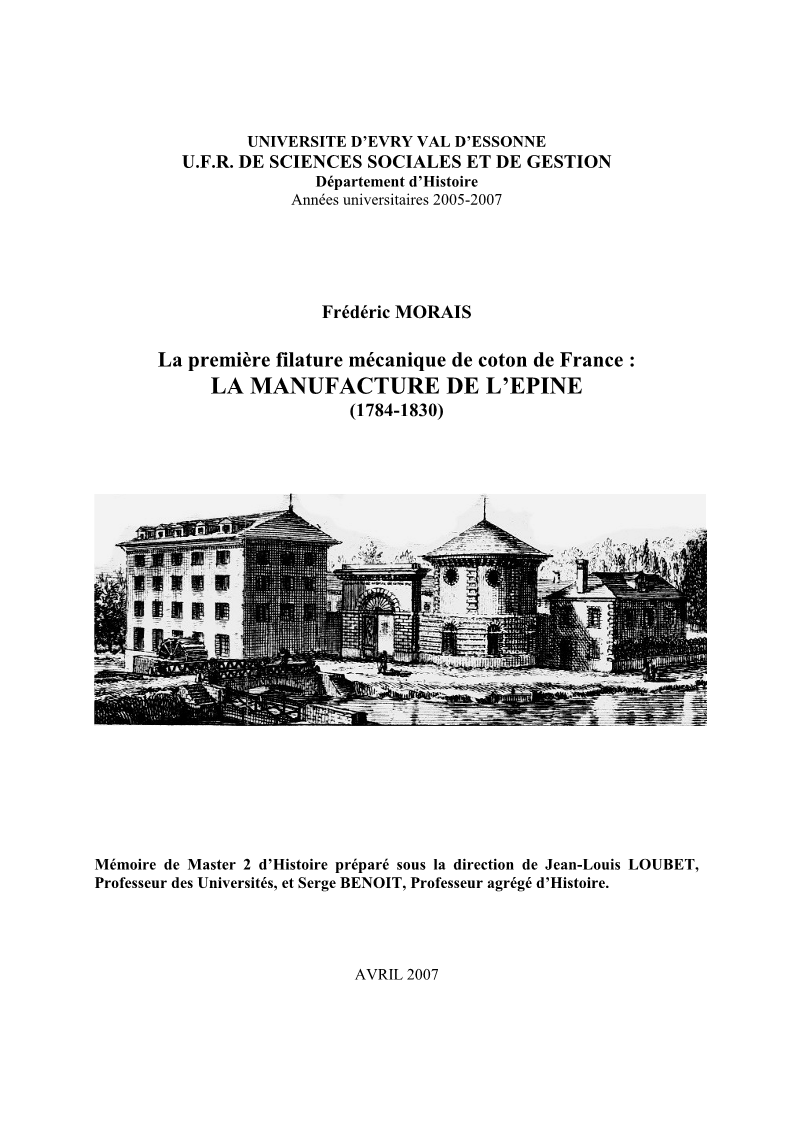 - Frédéric Morais, La première filature mécanique de coton de France. La manufacture de l'Épine (1784-1830) (21 cm sur 29, 533 p., illustrations, sources pp. 3-9, bibliographie pp. 10-25), Évry, Université d'Évry Val d'Essonne (“Mémoire de master 2 d'Histoire”), 2007.