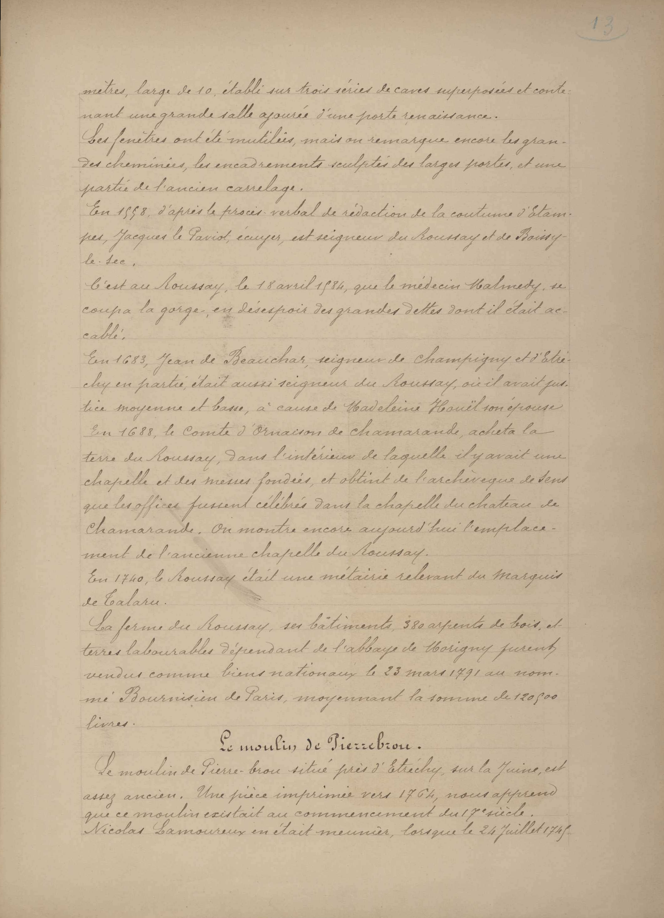 - La ferme du Roussay, ses bâtiments, 380 arpents de bois et terres labourables dépendant de l'abbaye de Morigny, furent vendus comme biens nationaux le 23 mars 1791 au nommé Bournisien de Paris, moyennant la somme de 120.500 livres.