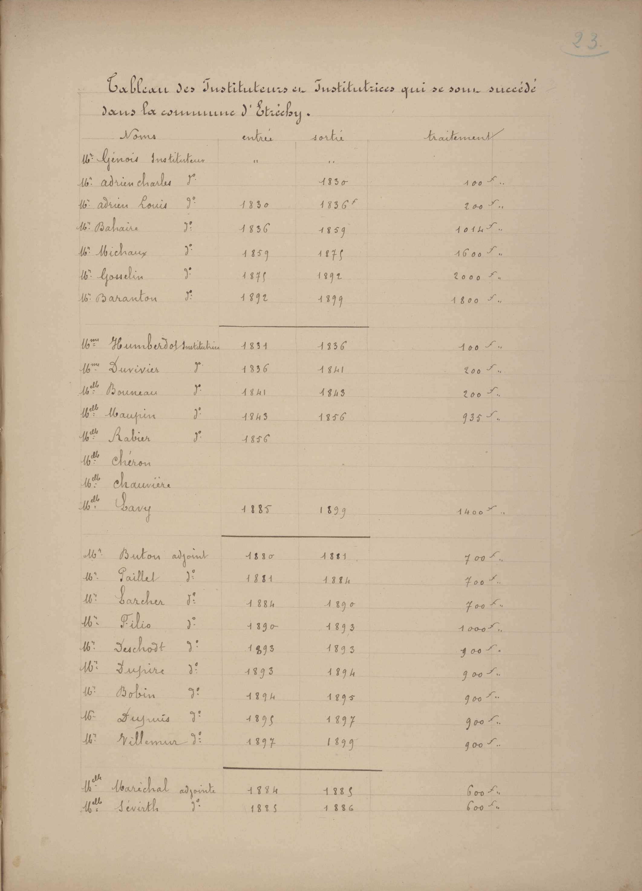 | Mlle Maréchal | adjointe | 1884 f. | 1885 f. | 600 f. |