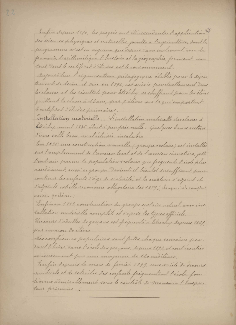- Aujourd'hui, l'organisation pédagogique établie pour le département de Seine-et-Oise en 1894 est suivie ponctuellement dans les classes, et les résultats pour Étréchy se chiffrent pour les élèves quittant la classe à treize ans par sept élèves sur dix, qui emportent le certificat d'études primaires.