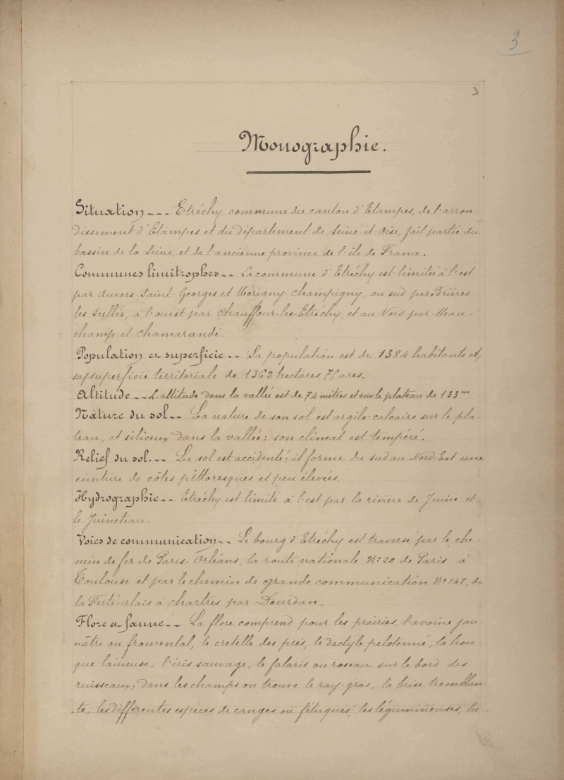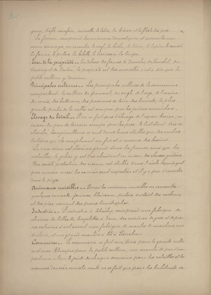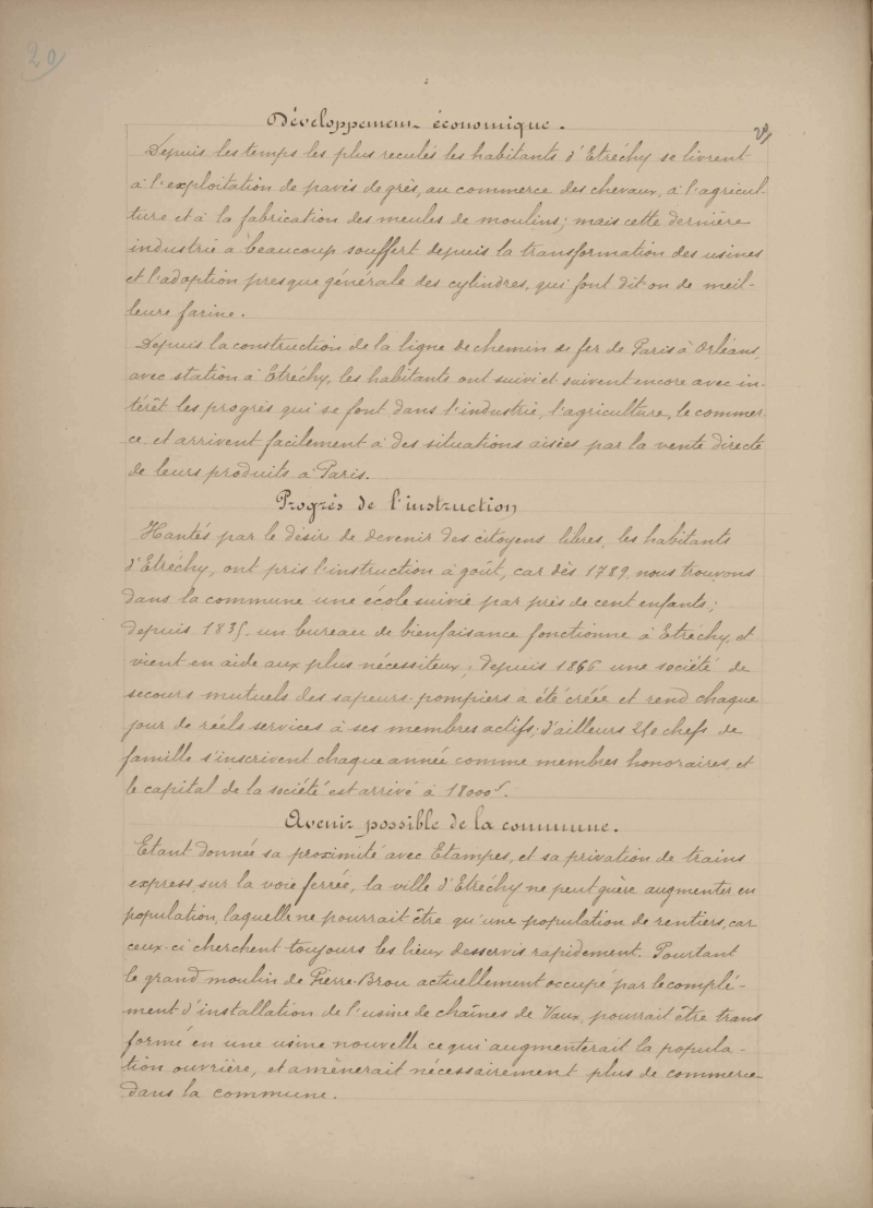 - Depuis la construction de la ligne de chemin de fer de Paris à Orléans avec station à Étréchy, les habitants ont suivi et suivent encore avec intérêt les progrès qui se font dans l'industrie, l'agriculture, le commerce et arrivent facilement à des situations aisées par la vente directe de leurs produits à Paris.
