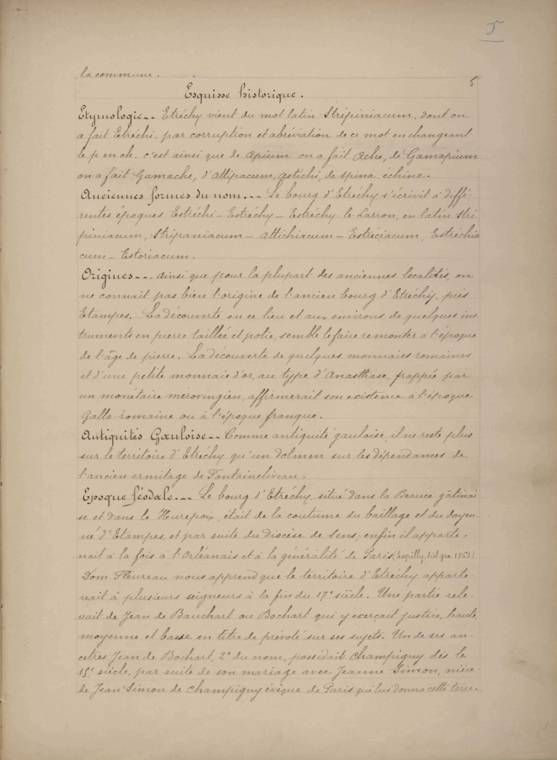 - Étymologie. — Étréchy vient du mot latin Stripiniacum dont on a fait Étréchi par corruption et abréviation de ce mot, en changeant le p en ch; c'est ainsi que de apium, on a fait ache, de Gamapium on a fait Gamache, d'Attipacum, Astichi, de spina, échine.