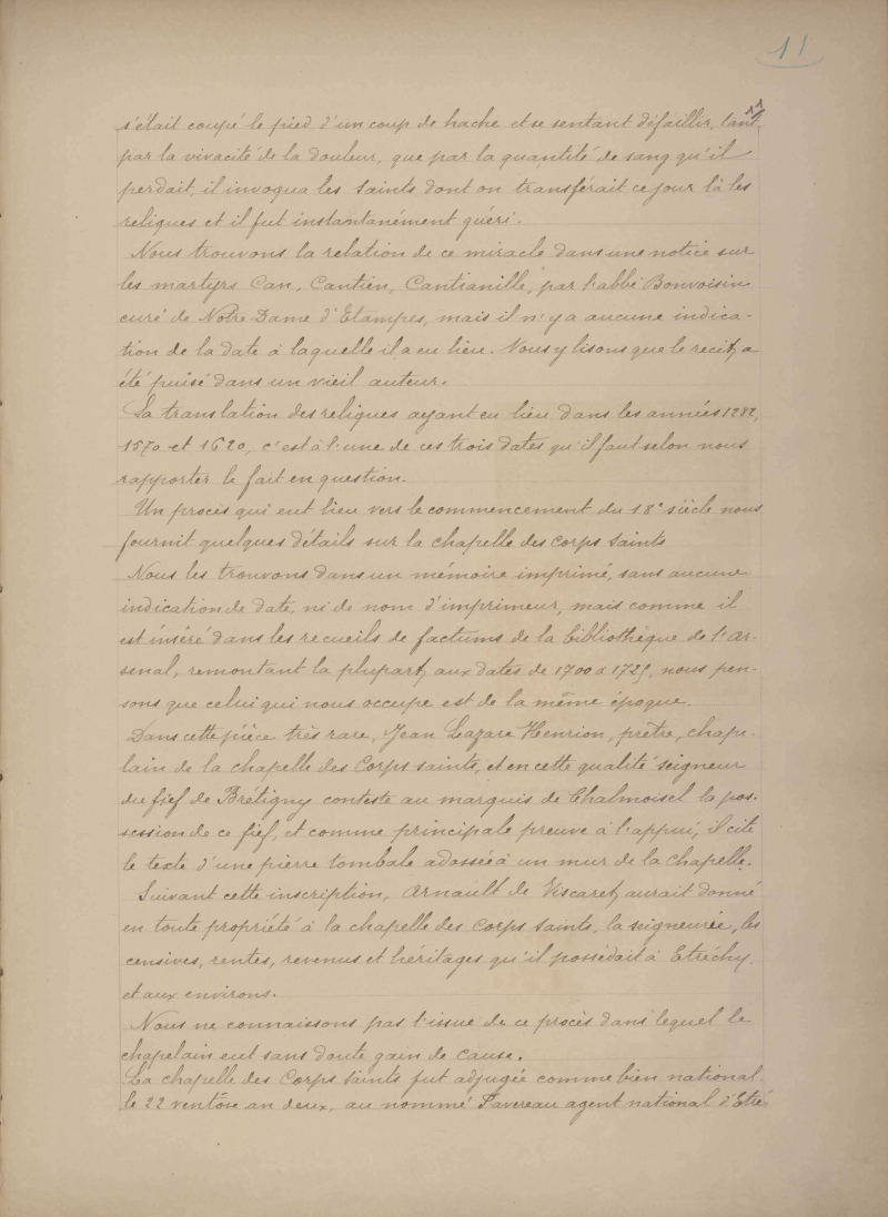 - Dans cette pièce très rare, Jean Lazare Henrion, prêtre, chapelain de la chapelle des Corps-Saints, et en cette qualité seigneur du fief de Brétigny, conteste au marquis de Chalmasel la possession de ce fief, et comme principale preuve à l'appui, il cite le texte d'une pierre tombale adossée à un mur de la chapelle.