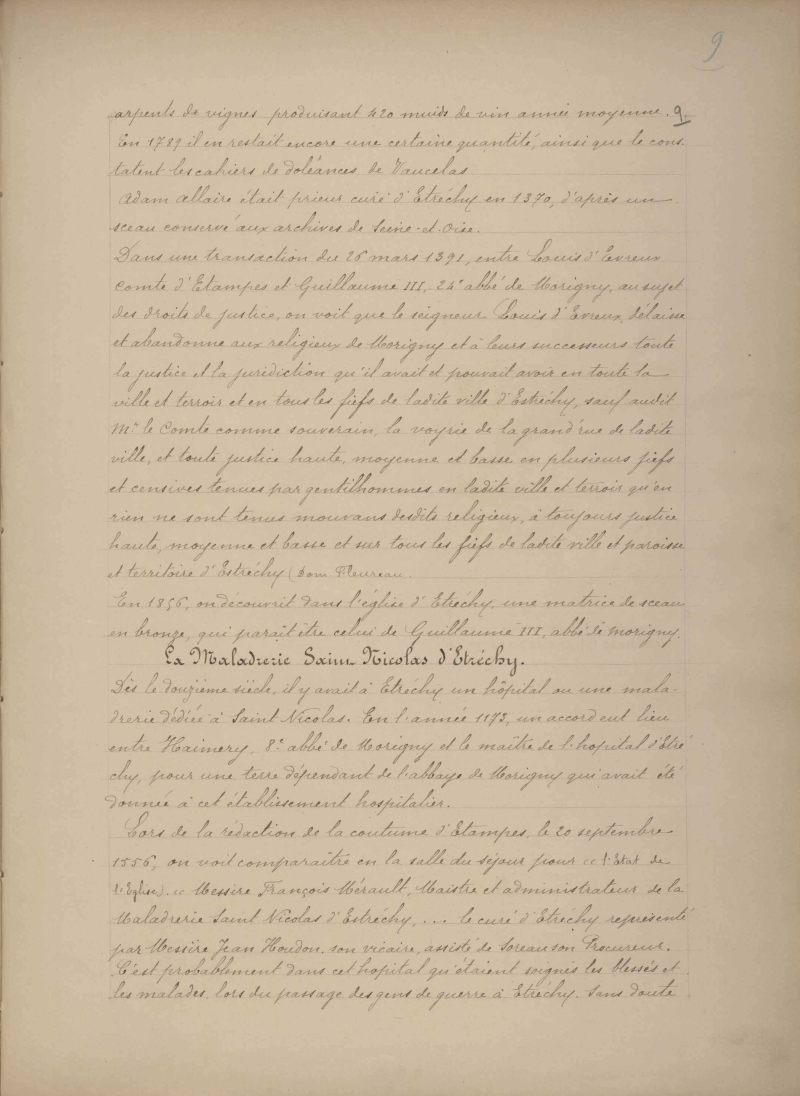 - Nous avons vu plus haut que les émoluments dus au prieur d'Étréchy étaient payés en vin, au commencement du XIIIe siècle, cela prouve qu'il y avait des vignes à Étréchy à cette époque.