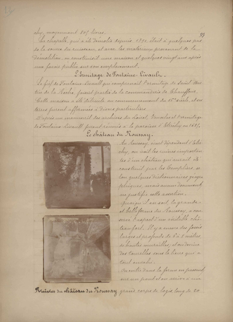 - Au Roussay, écart dépendant d'Étréchy, on voit les ruines importantes d'un château qui aurait été construit par les Templiers, selon quelques dictionnaires géographiques, mais aucun document ne justifie cette assertion.