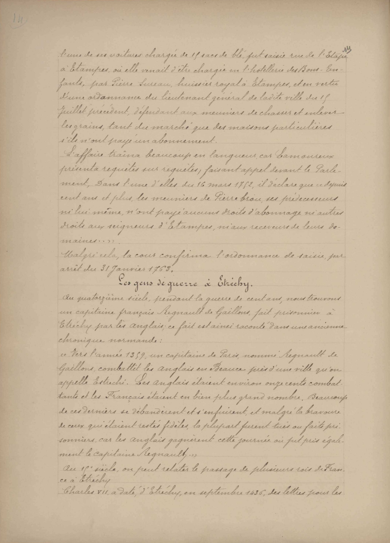 - Au XIVe siècle, pendant la guerre de cent ans, nous trouvons un capitaine français, Régnault de Gaillons, fait prisonnier à Étréchy par les Anglais, ce fait est ainsi raconté dans une ancienne chronique normande:
