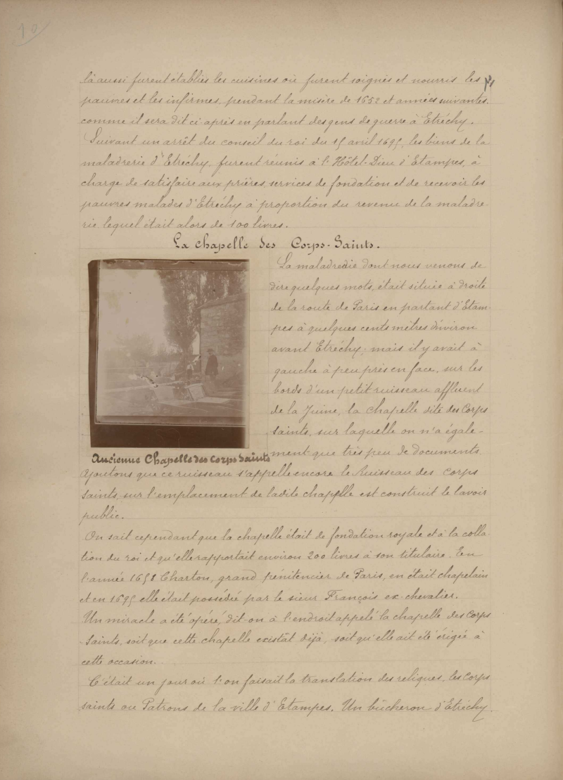 - La maladrerie dont nous venons de dire quelques mots, était située à droite de la route de Paris en partant d'Étampes à quelques cent mètres environ avant Étréchy, mais il y avait à gauche à peu près en face, sur les bords d'un petit ruisseau affluent de la Juine, la chapelle dite des Corps-Saints, sur laquelle on n'a également que très peu de documents. Ajoutons que ce ruisseau s'appelle encore le ruisseau des Corps-Saints, sur l'emplacement de ladite chapelle est construit le lavoir public.