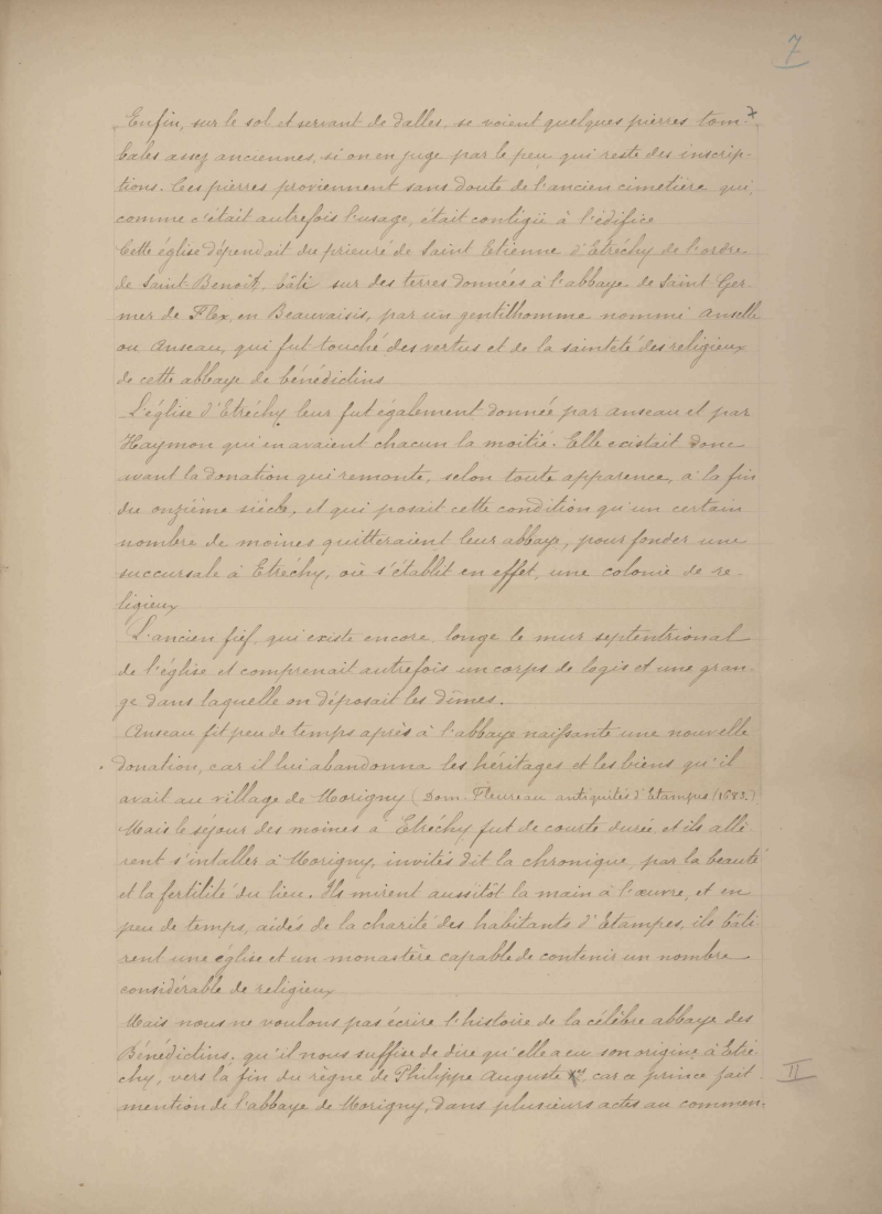 - Anseau fit peu de temps après à l'abbaye naissante une nouvelle donation, car il lui abandonna les héritages et les biens qu'il avait au village de Morigny (Dom Fleureau, Antiquités d'Étampes, 1683).