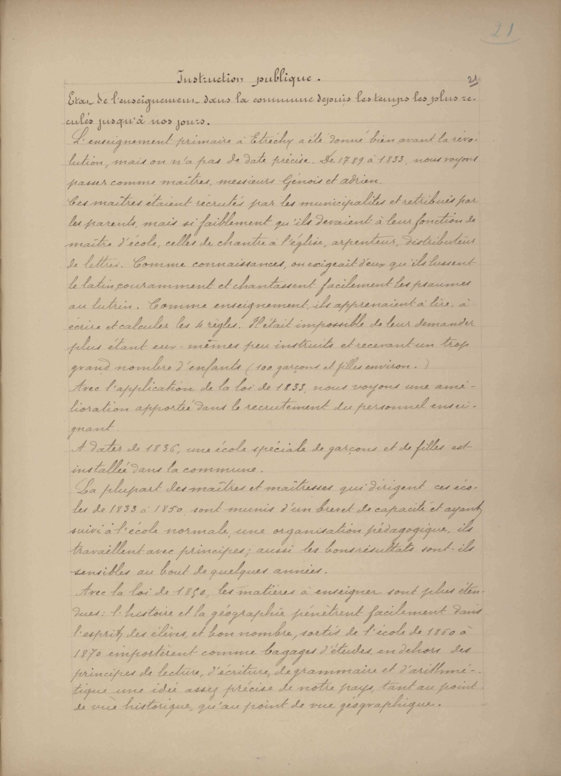 État de l'enseignement dans la commune depuis les temps les plus reculés jusqu'à nos jours